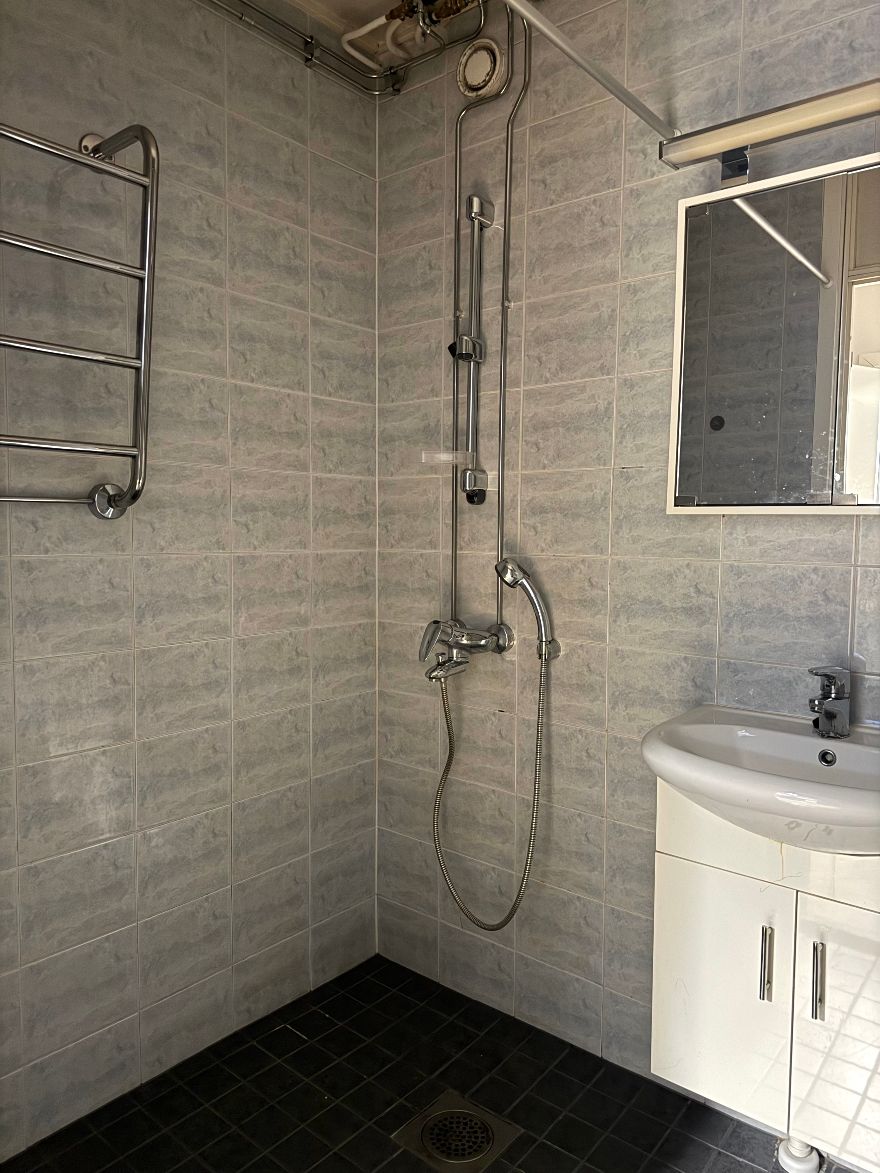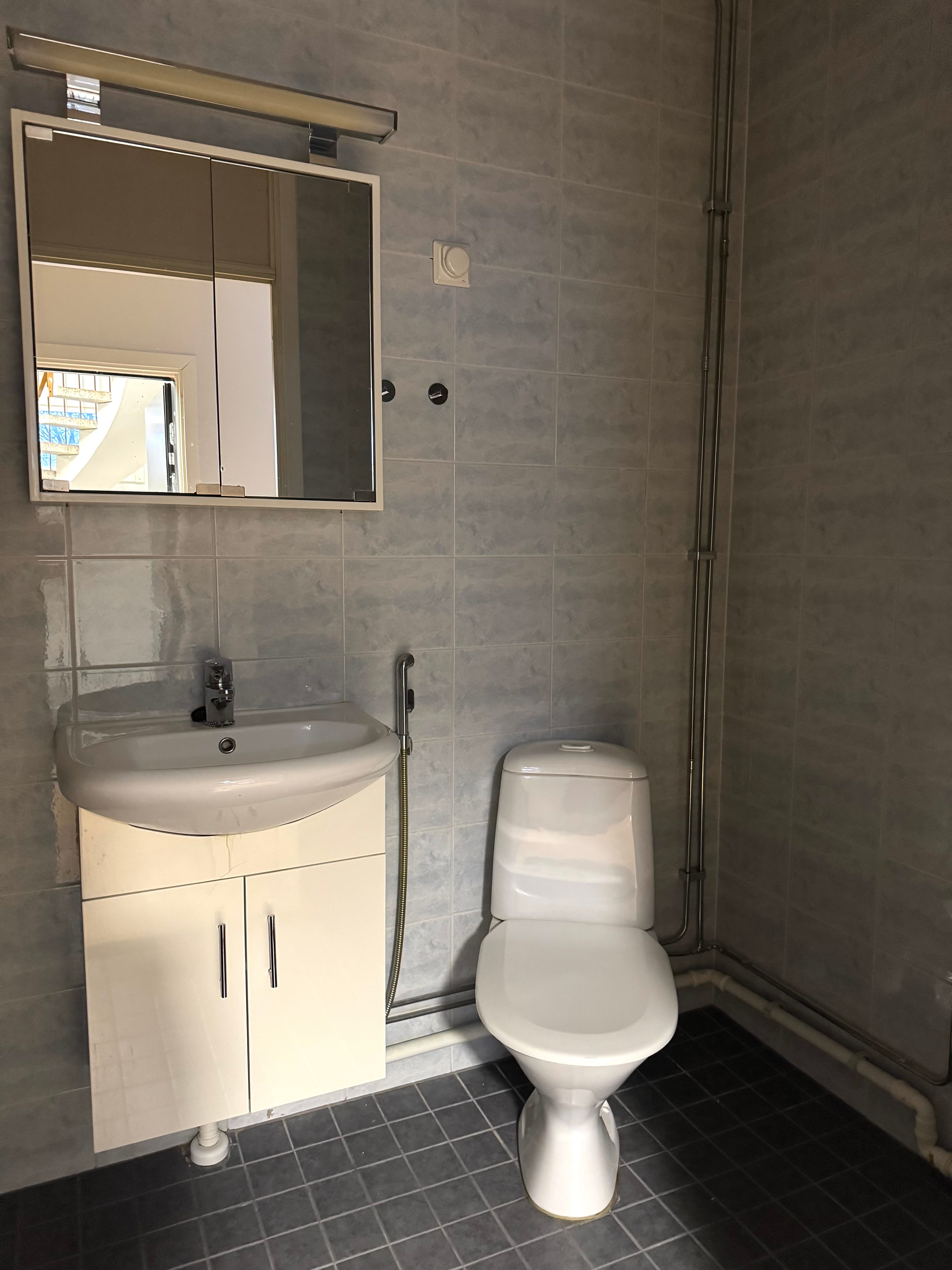 Suihku, wc-istuin, käsienpesuallas, allaskaappi, peilikaappi, pkl, laatoitus, lattialämmitys