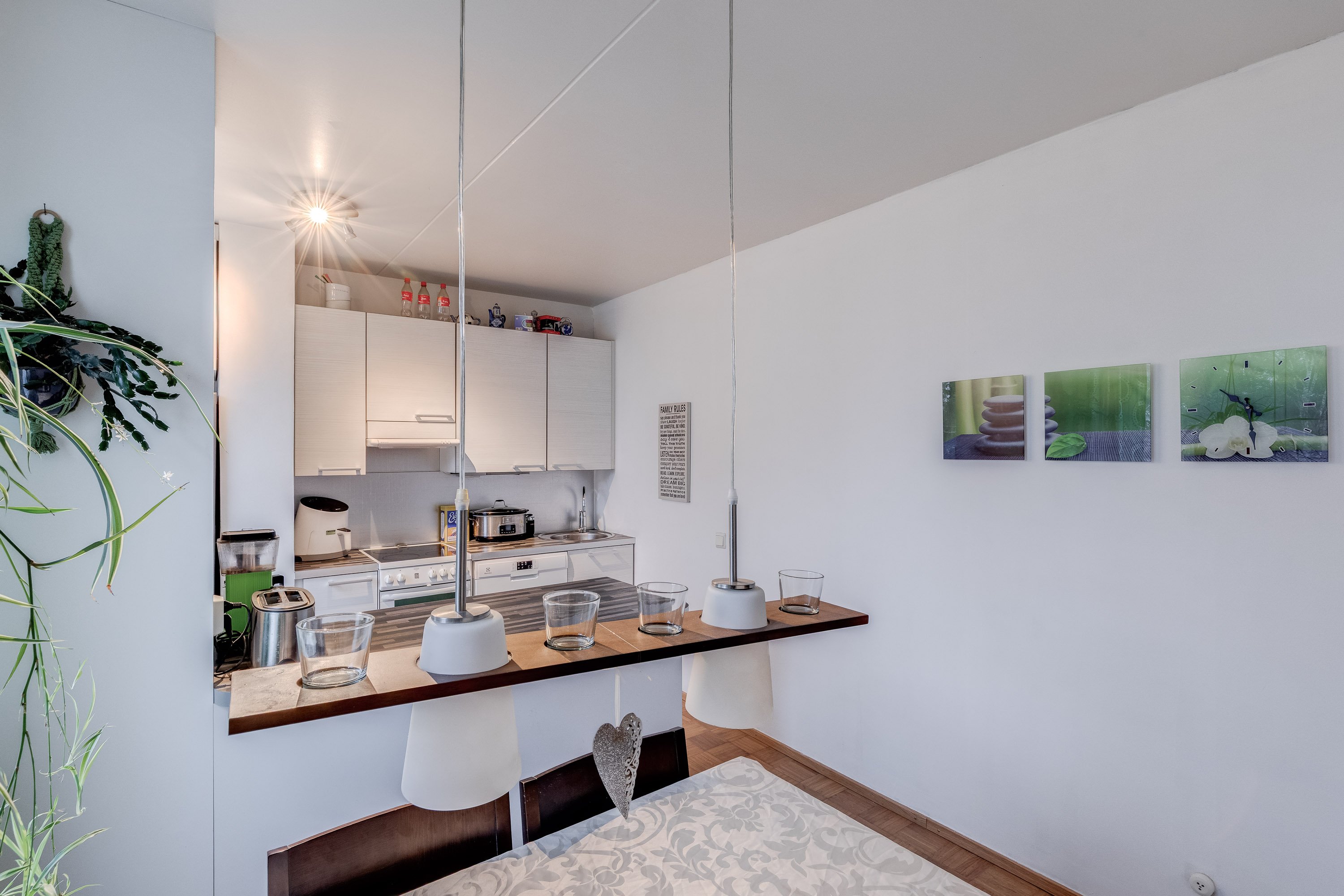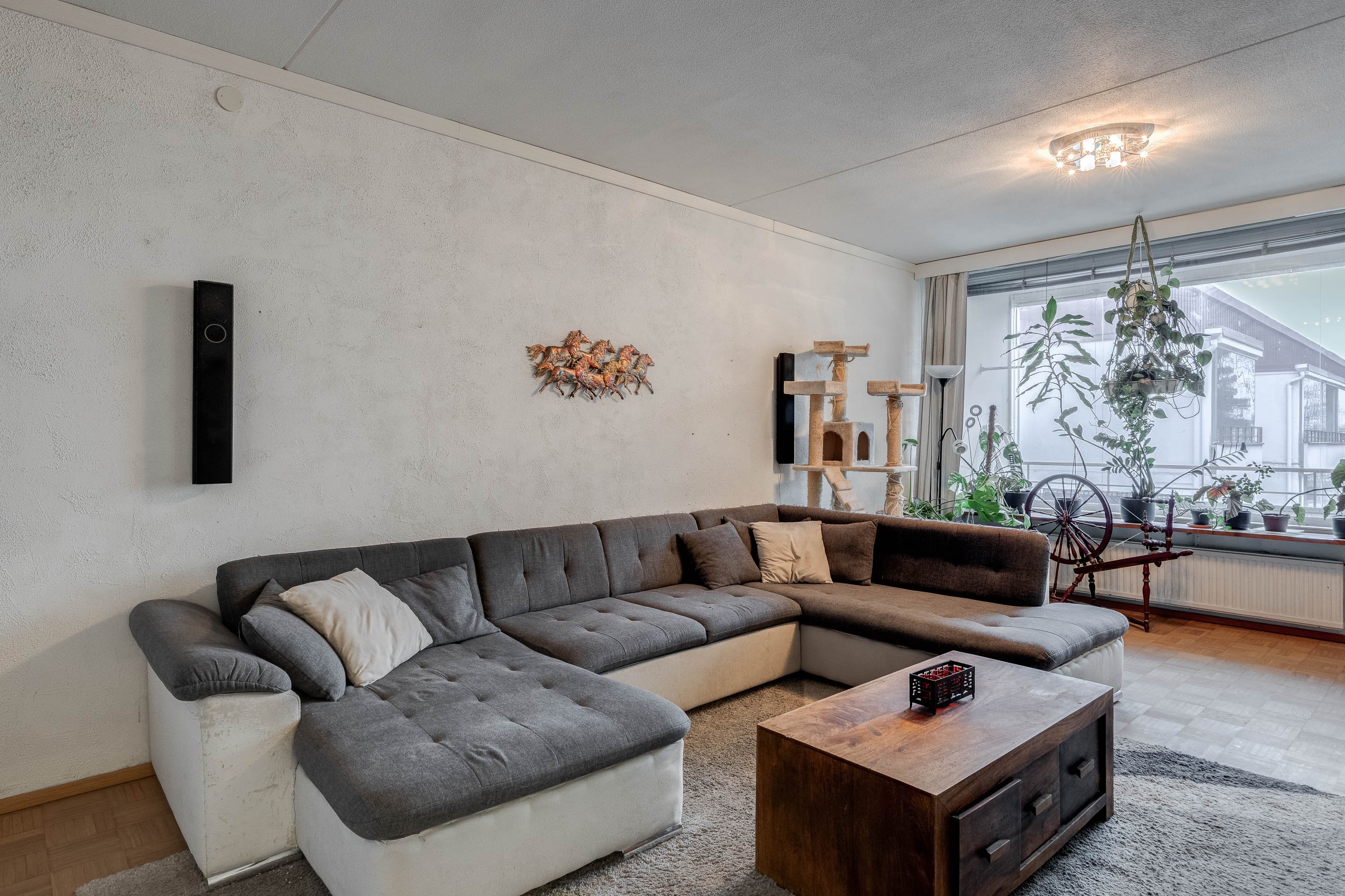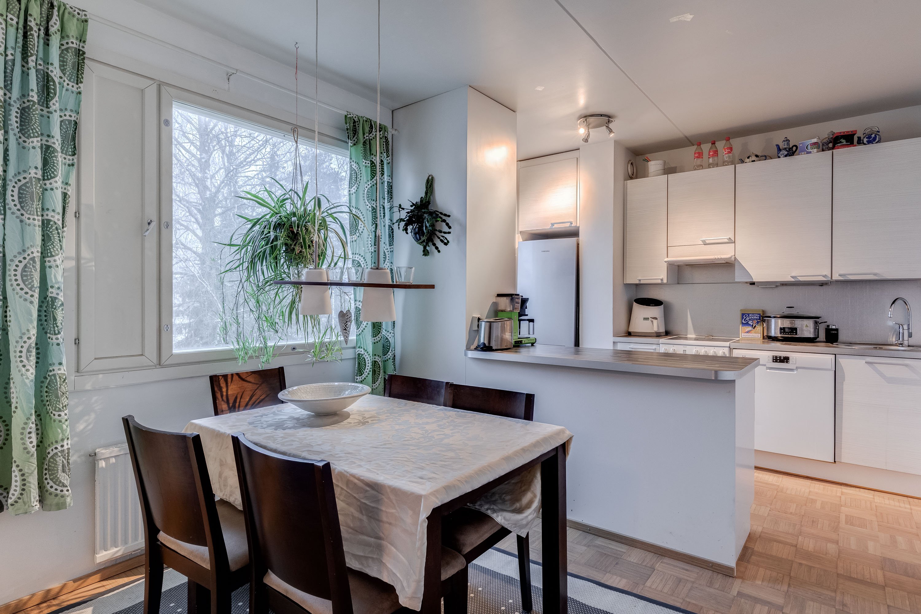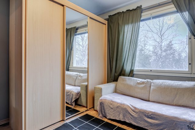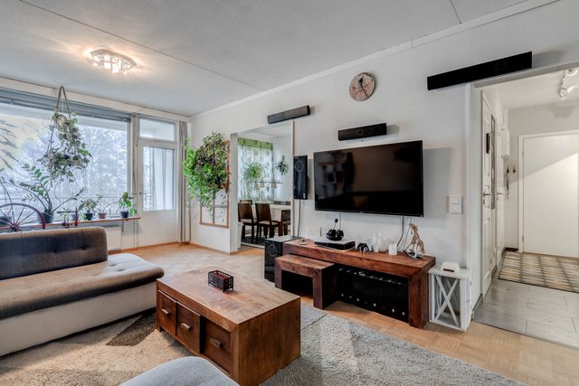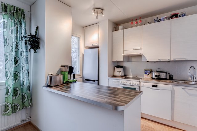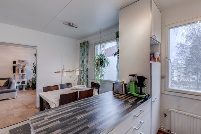Asunto on hyvässä kunnossa ja koko huoneiston parketti on juuri huollettu. Puustellin keittiö on varustettu nykyaikaisilla laitteilla ja isolle ruokailupöydälle on oma paikkansa.