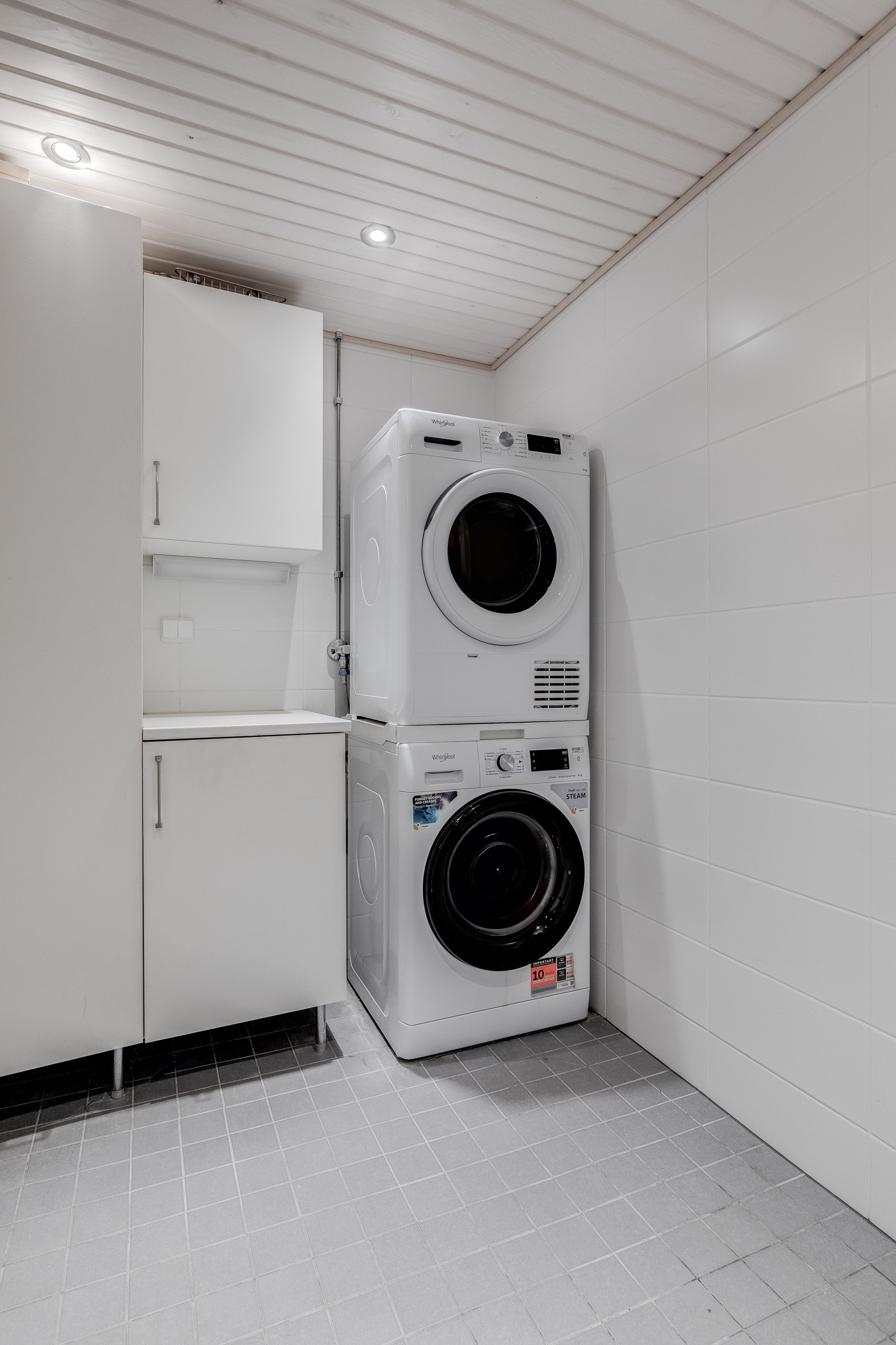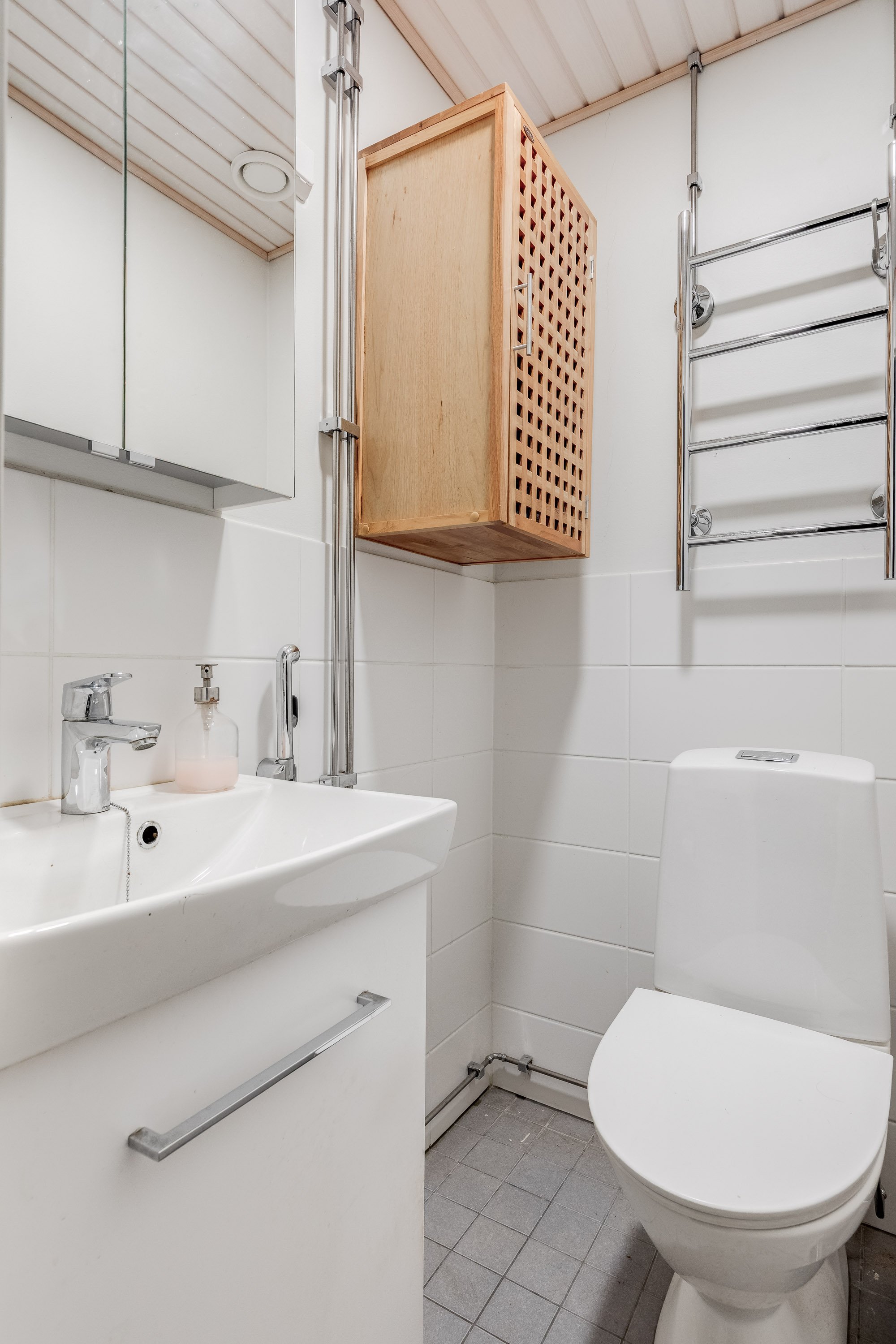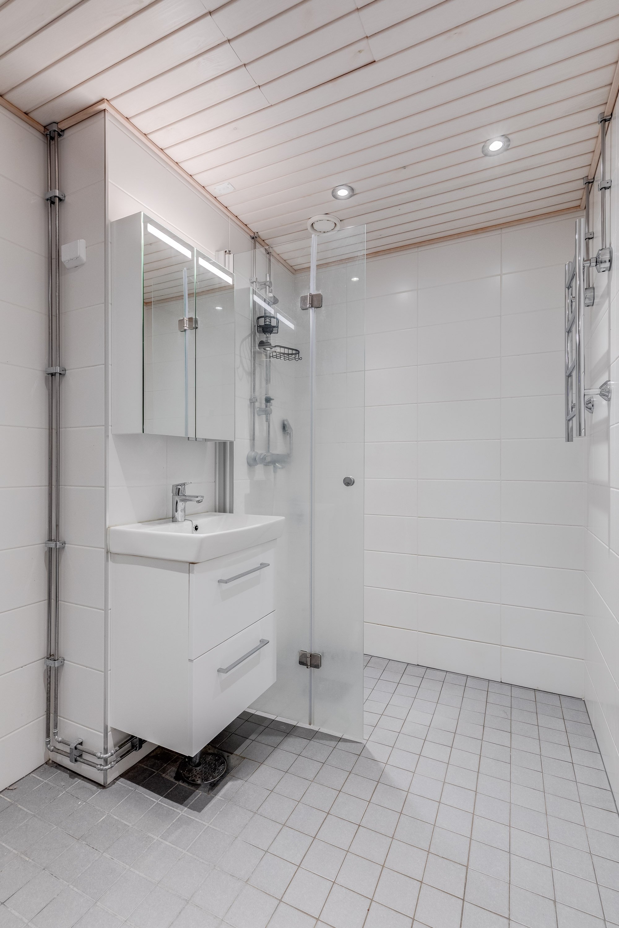 Suihku, suihkuseinä, peilikaappi, pesuallas, allaskaappi, pesukoneliitäntä, lattialämmitys ja kaapistot