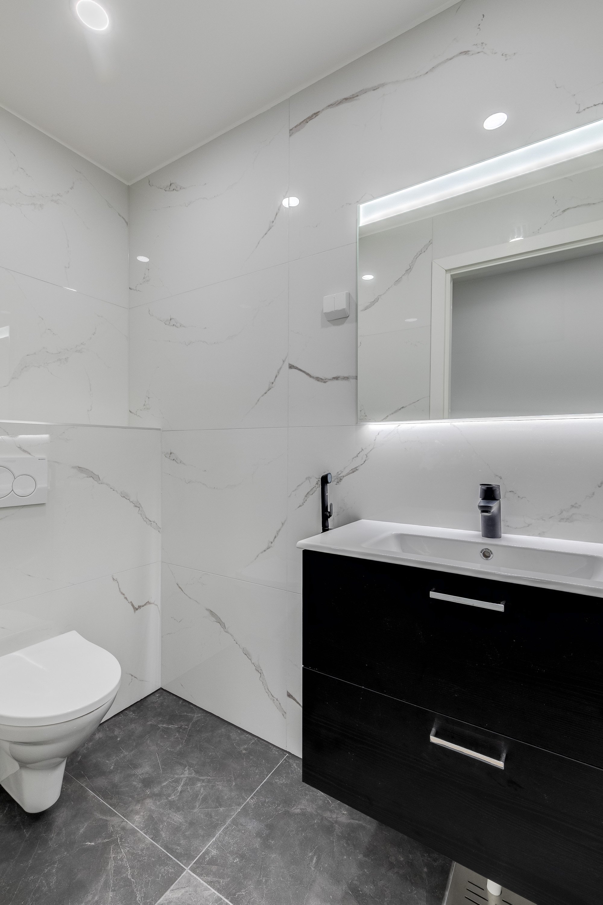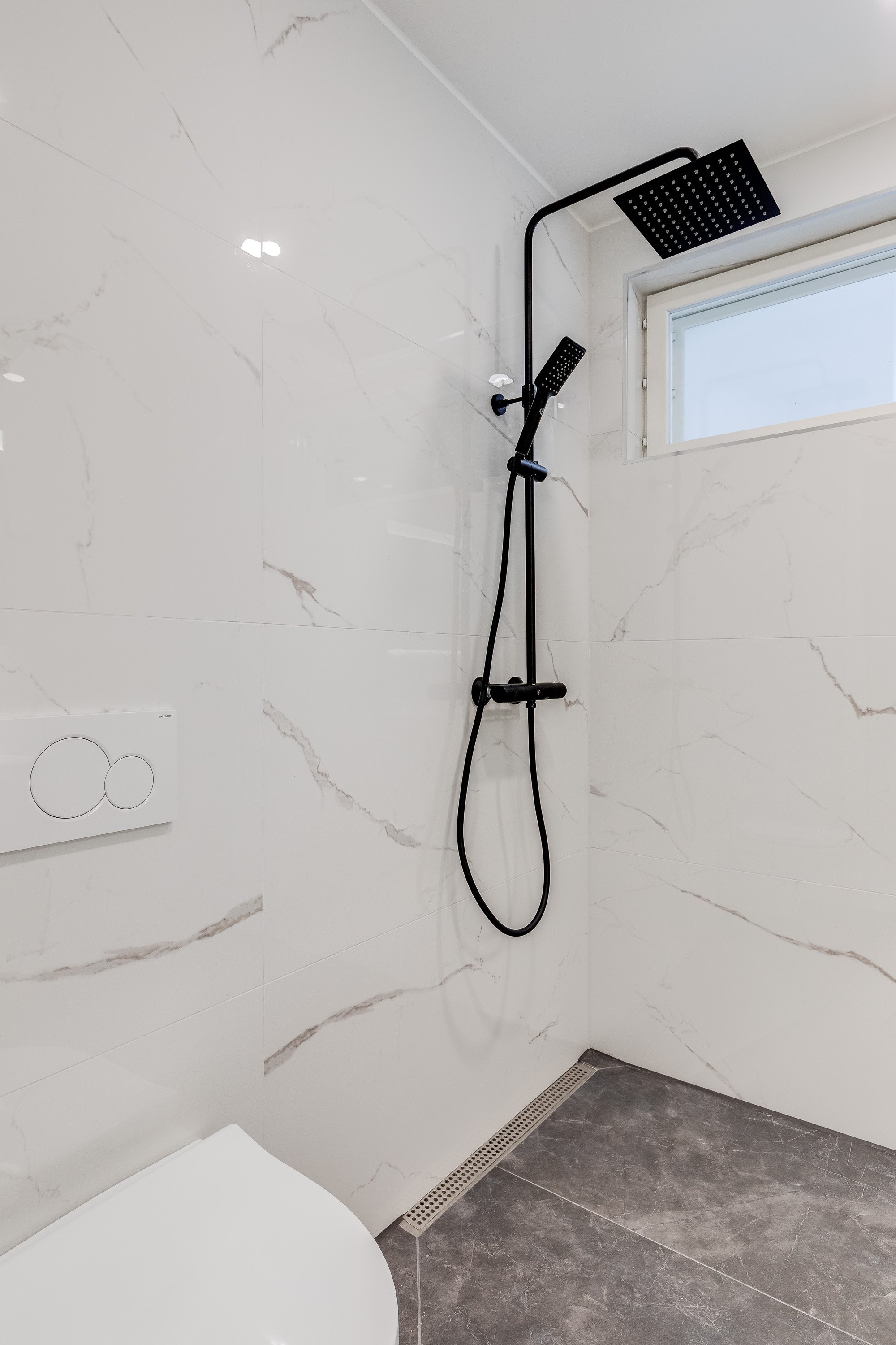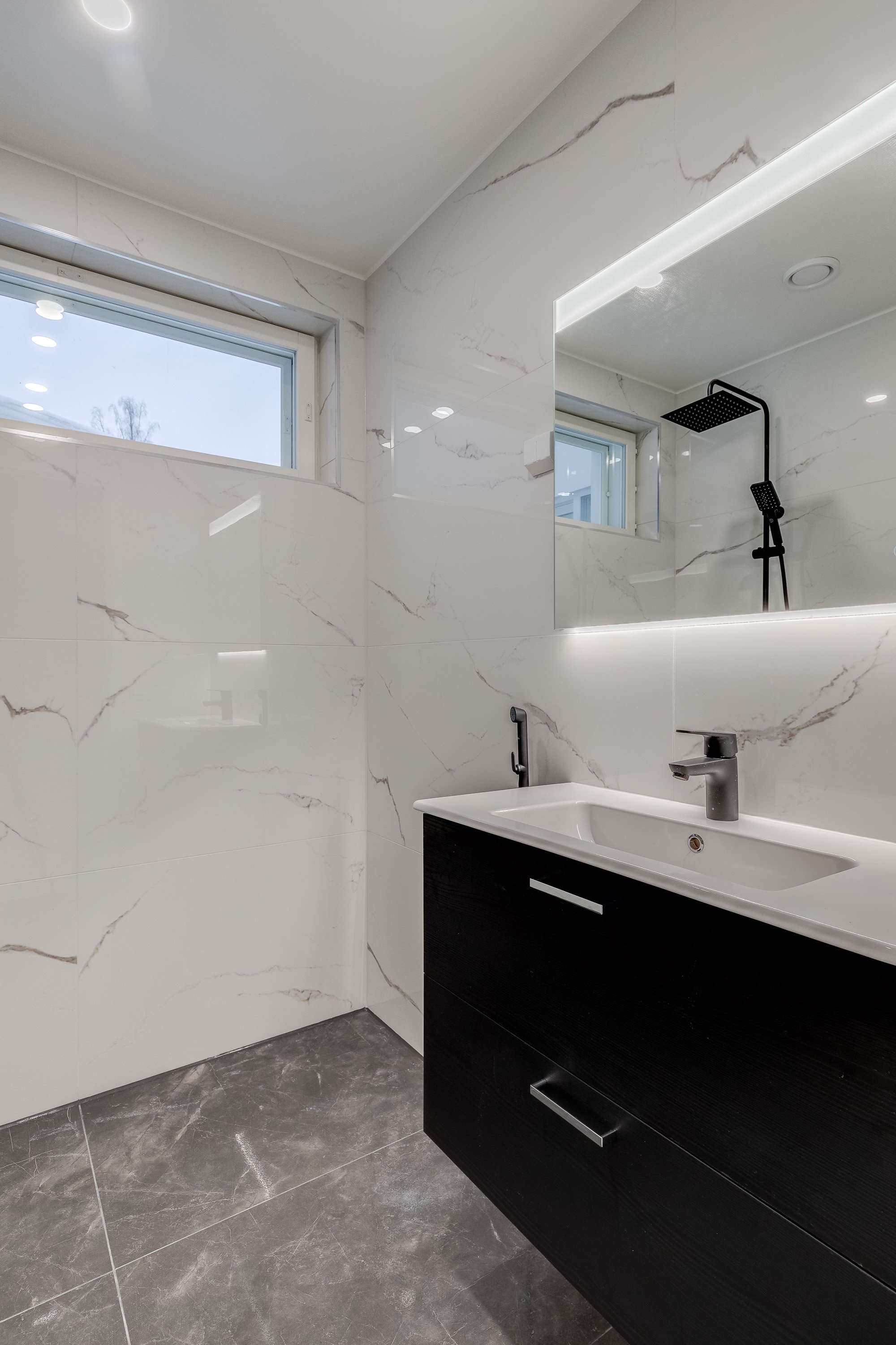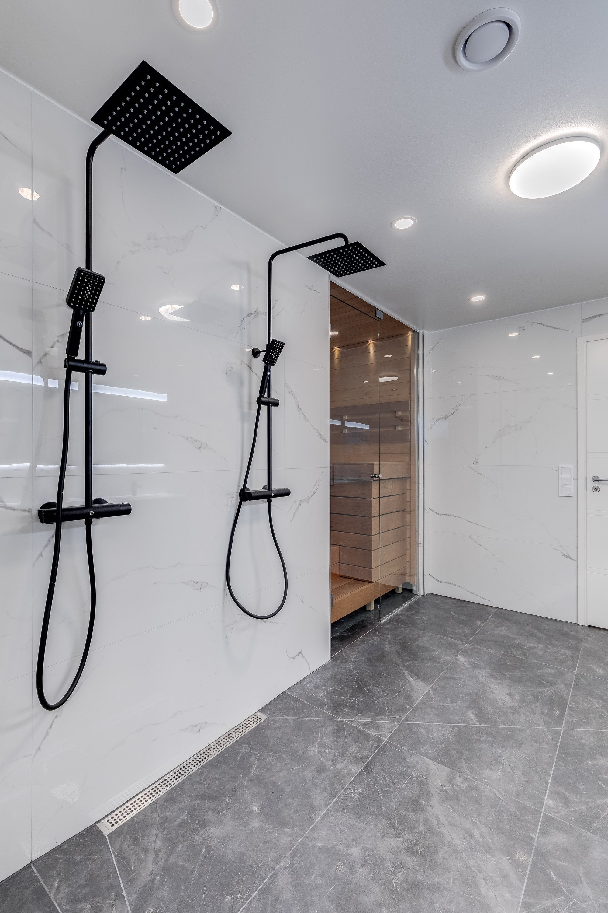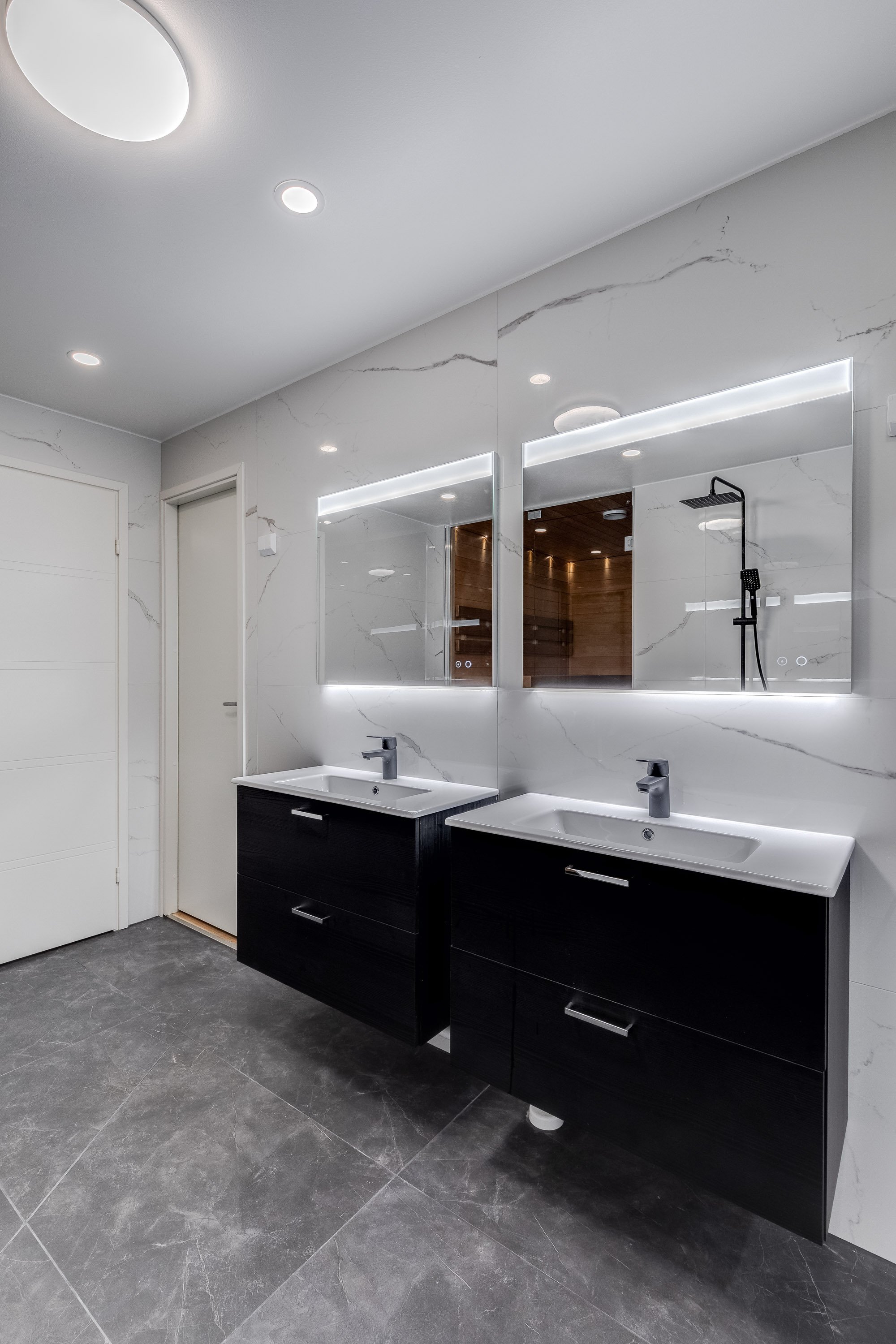 Suihku (x 2 sadesuihku (Svedberg)), pesuallas (x 2 (Temal)), wc-istuin (Seinämalli (Ido)), allaskaappi (x 2 (Temal)), peili (x 2 Valaistu), bidee-suihku, lattialämmitys ja unidrain linjalattiakaivo