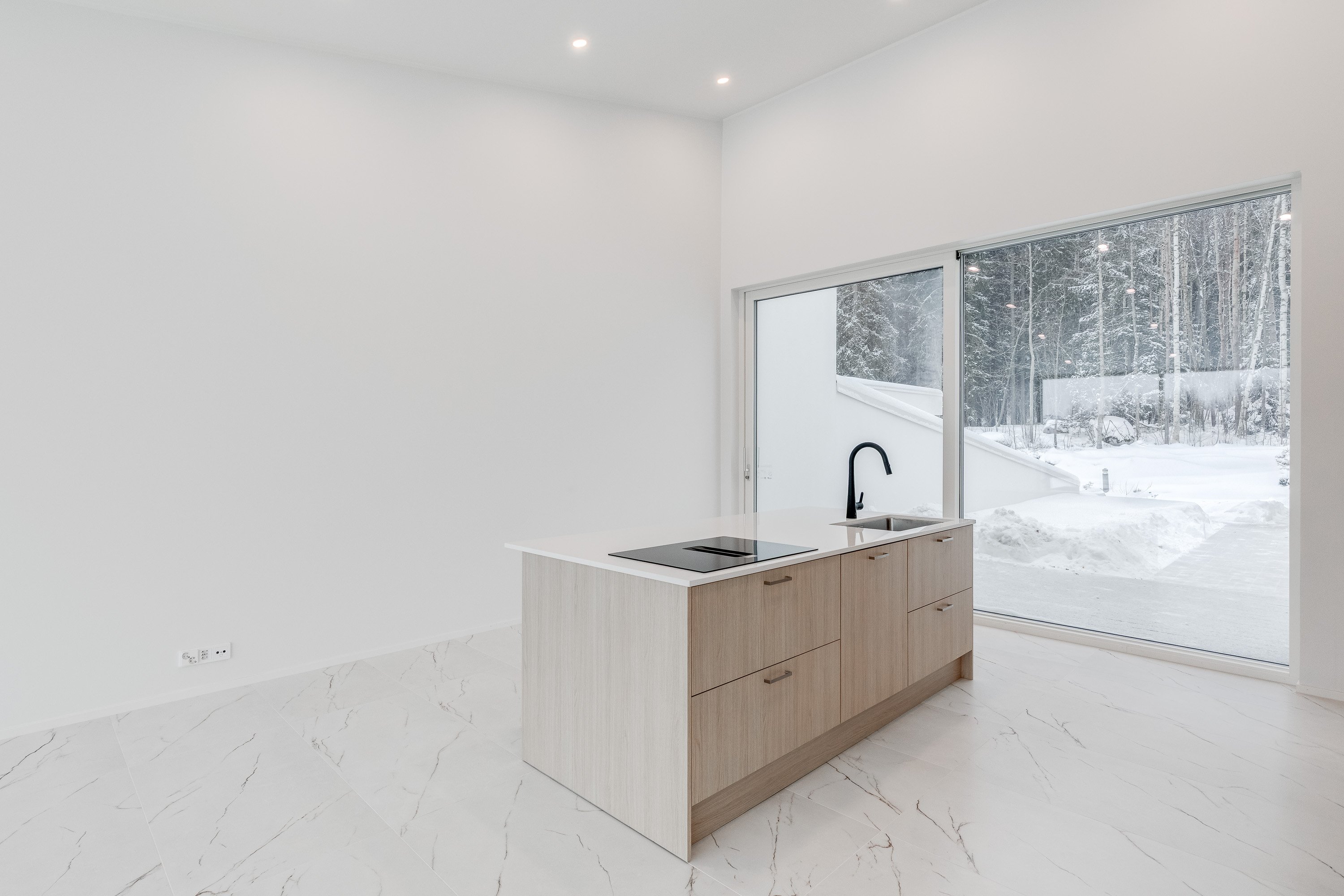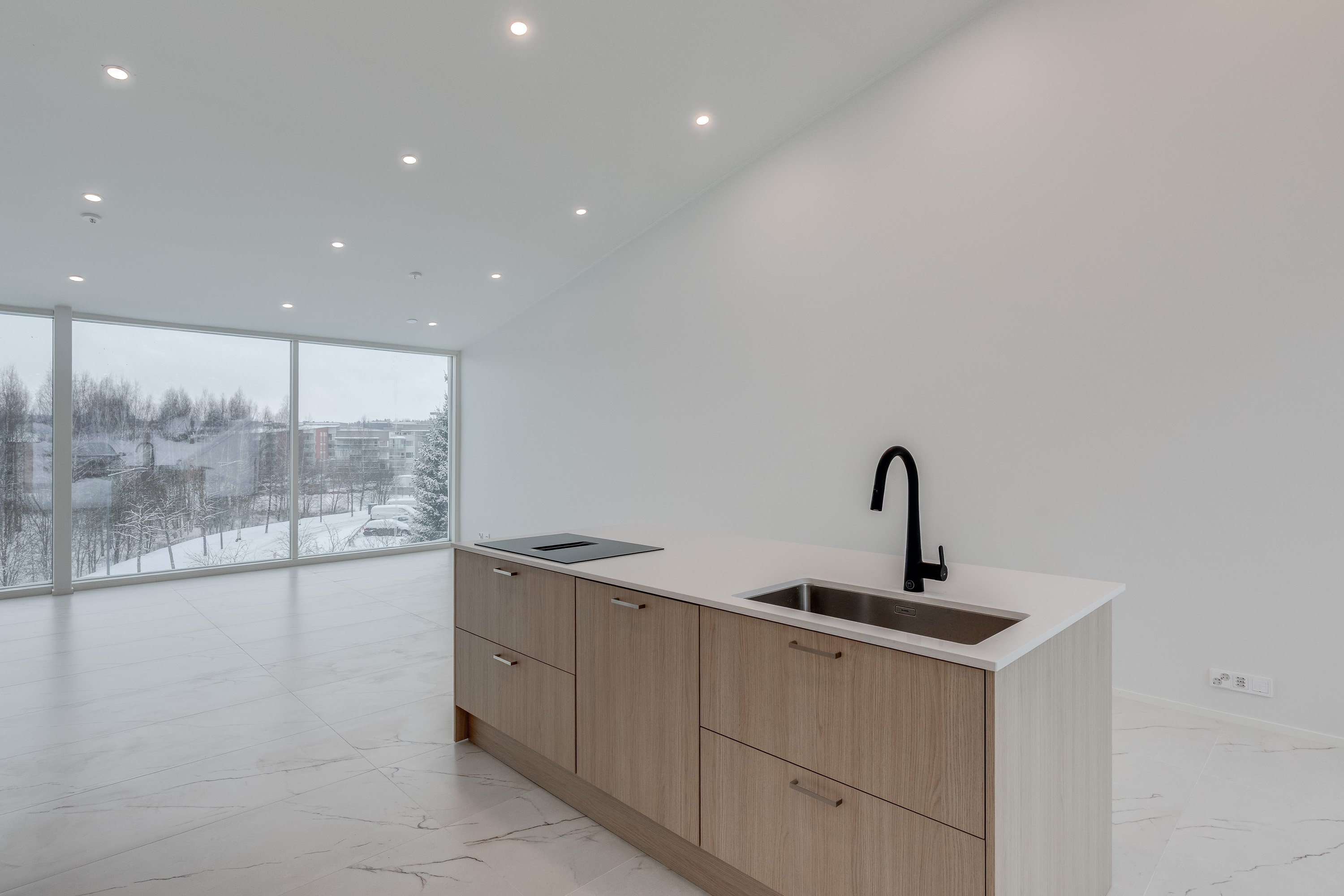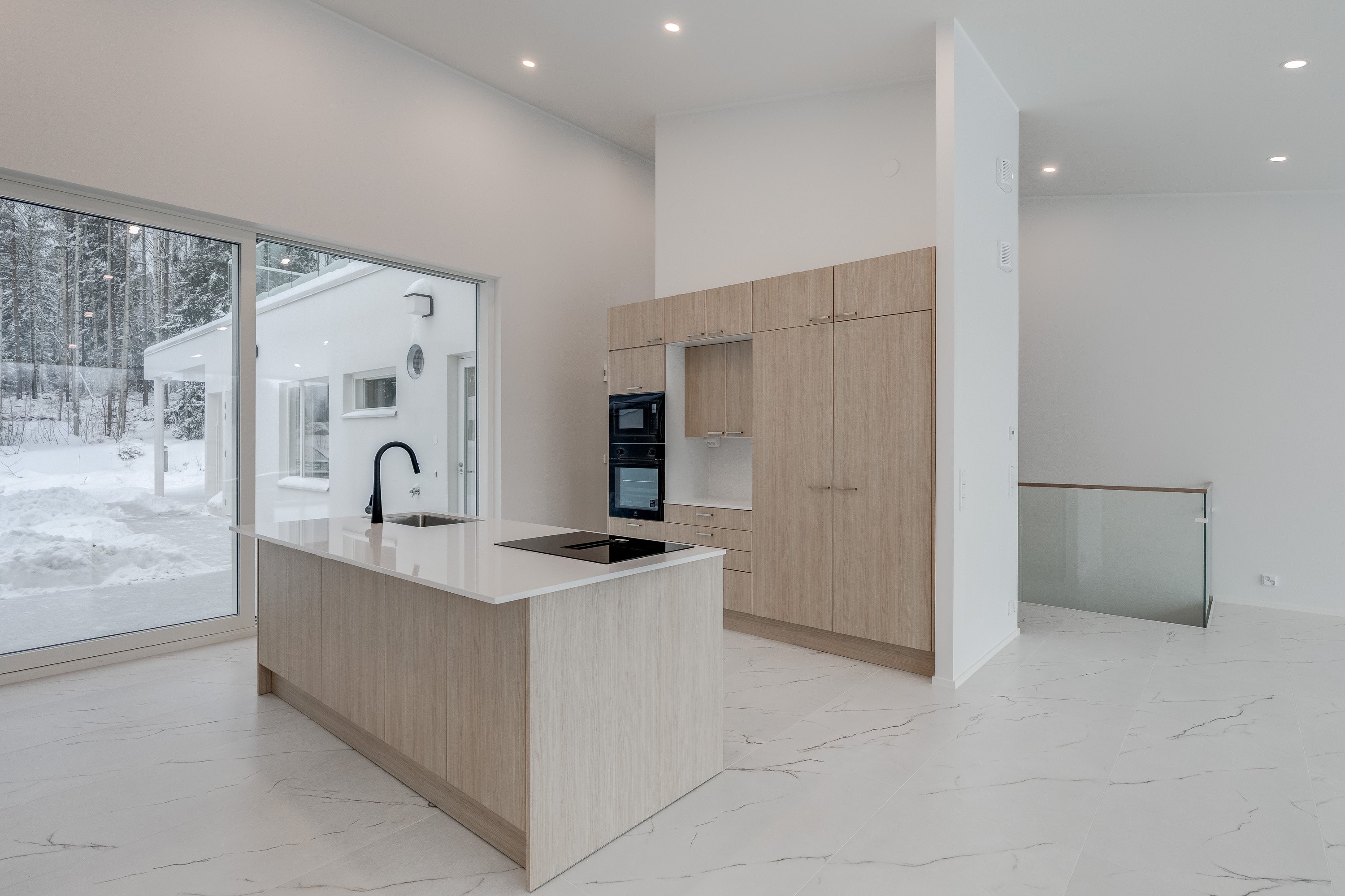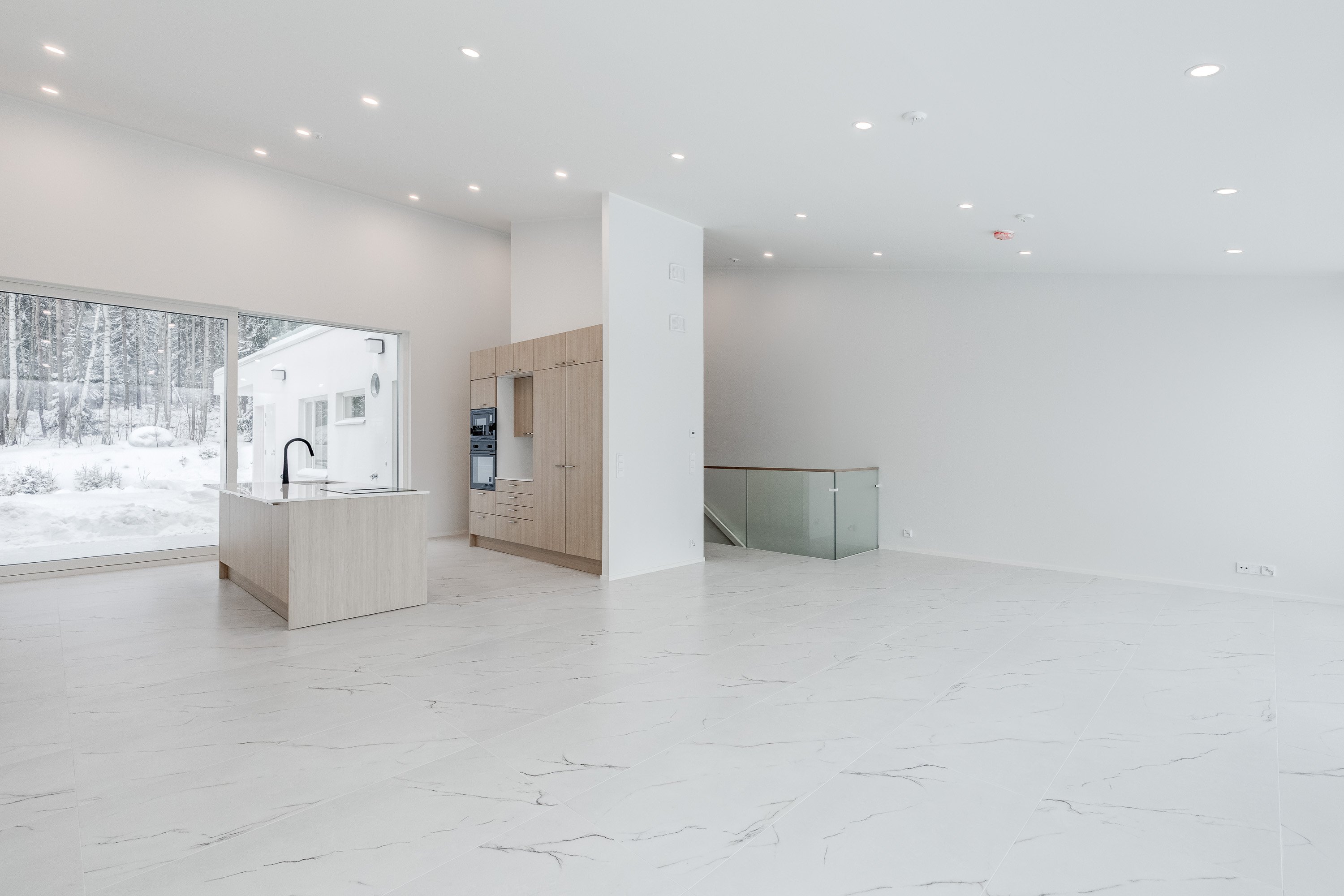 Keittiö on varustettu laadukkailla kvartsikomposiittitasoilla ja nykyaikaisilla kodinkoneilla. Yläkerran lattiat tyylikästä 60x120 laattaa. Kylpyhuoneet ovat käytännöllisiä, varustettu sadesuihkuilla, Unidrain kaivoilla ja lattialämmityksellä. Alakerrassa laadukas vinyylilattia. Alakerrasta löytyy myös iso harrastehuone joka taipuu vaikka elokuva -tai pelihuoneeksi.