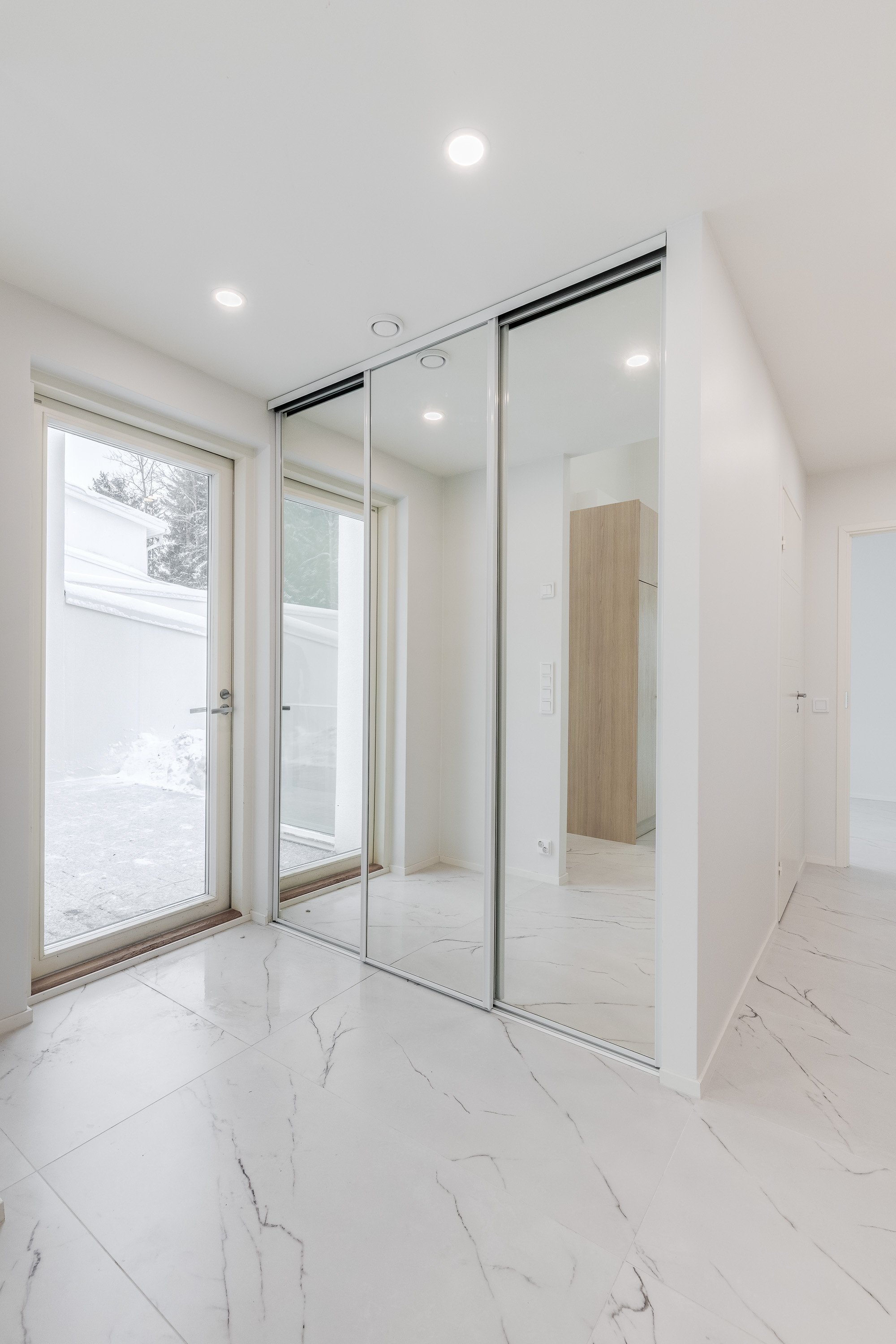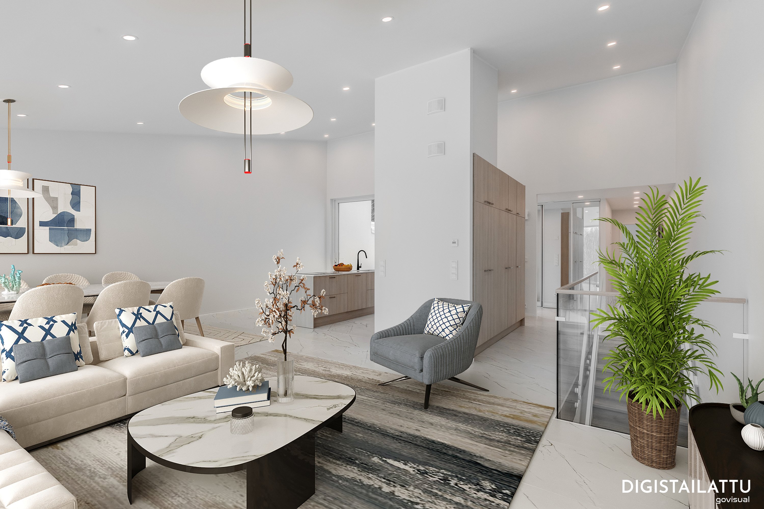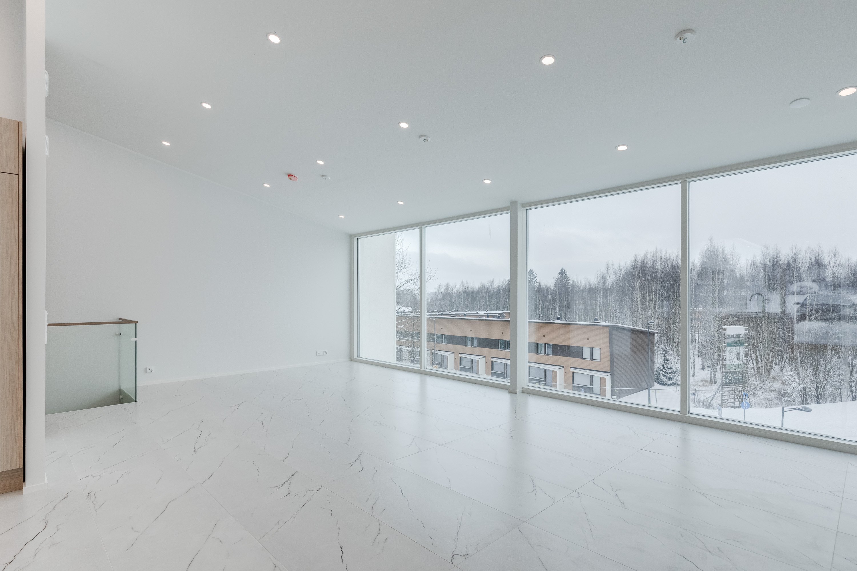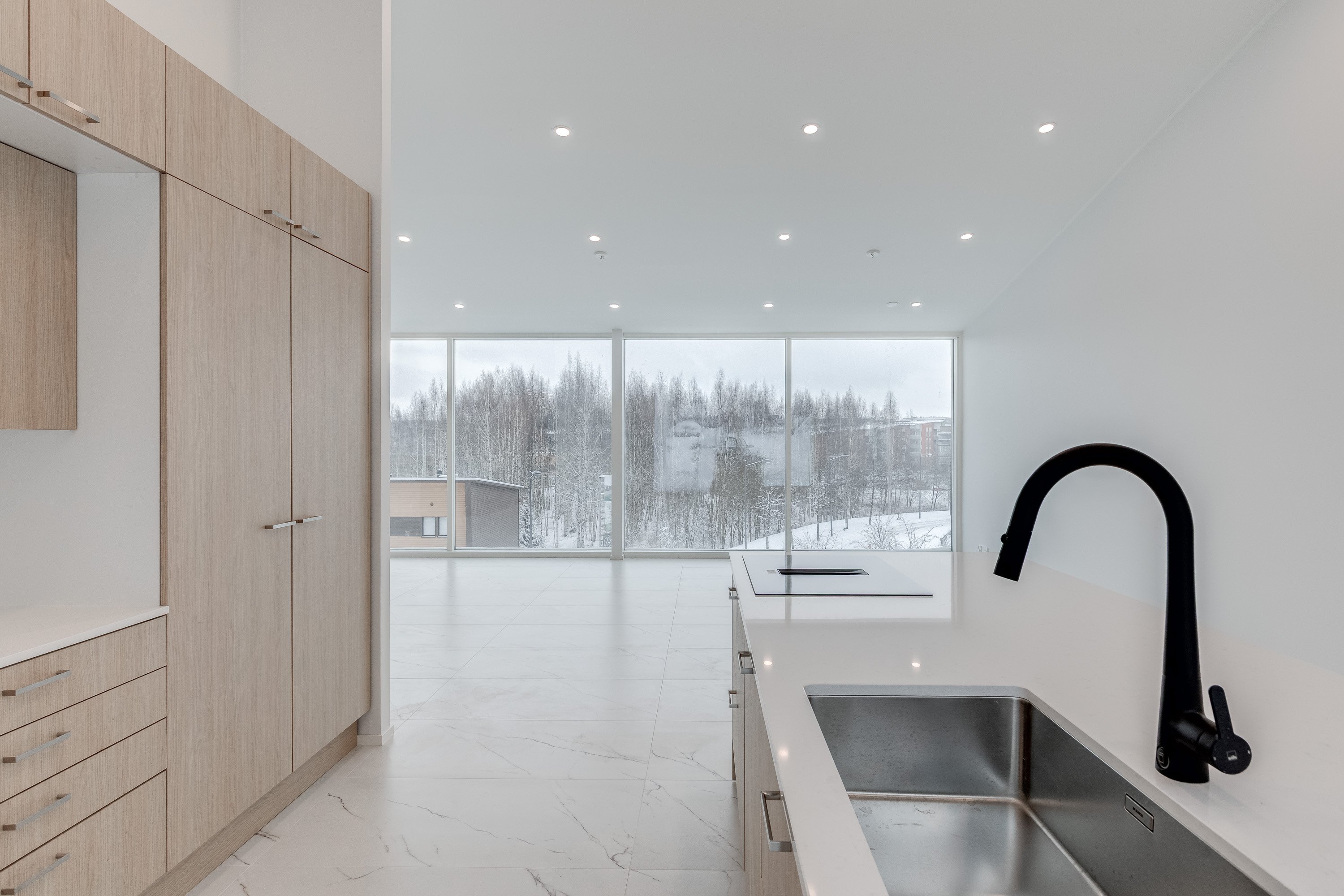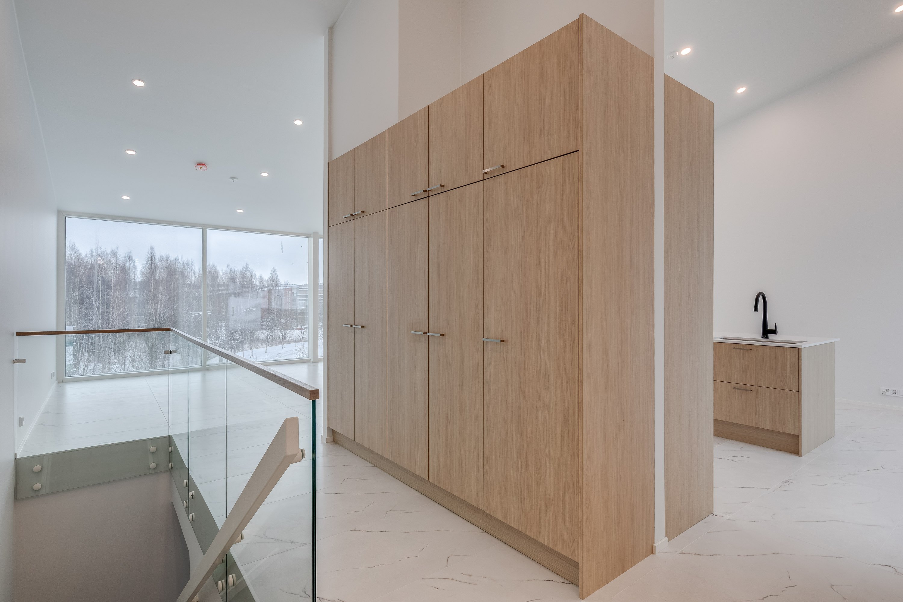Keittiö on varustettu laadukkailla kvartsikomposiittitasoilla ja nykyaikaisilla kodinkoneilla. Yläkerran lattiat tyylikästä 60x120 laattaa. Kylpyhuoneet ovat käytännöllisiä, varustettu sadesuihkuilla, Unidrain kaivoilla ja lattialämmityksellä. Alakerrassa laadukas vinyylilattia. Alakerrasta löytyy myös iso harrastehuone joka taipuu vaikka elokuva -tai pelihuoneeksi.