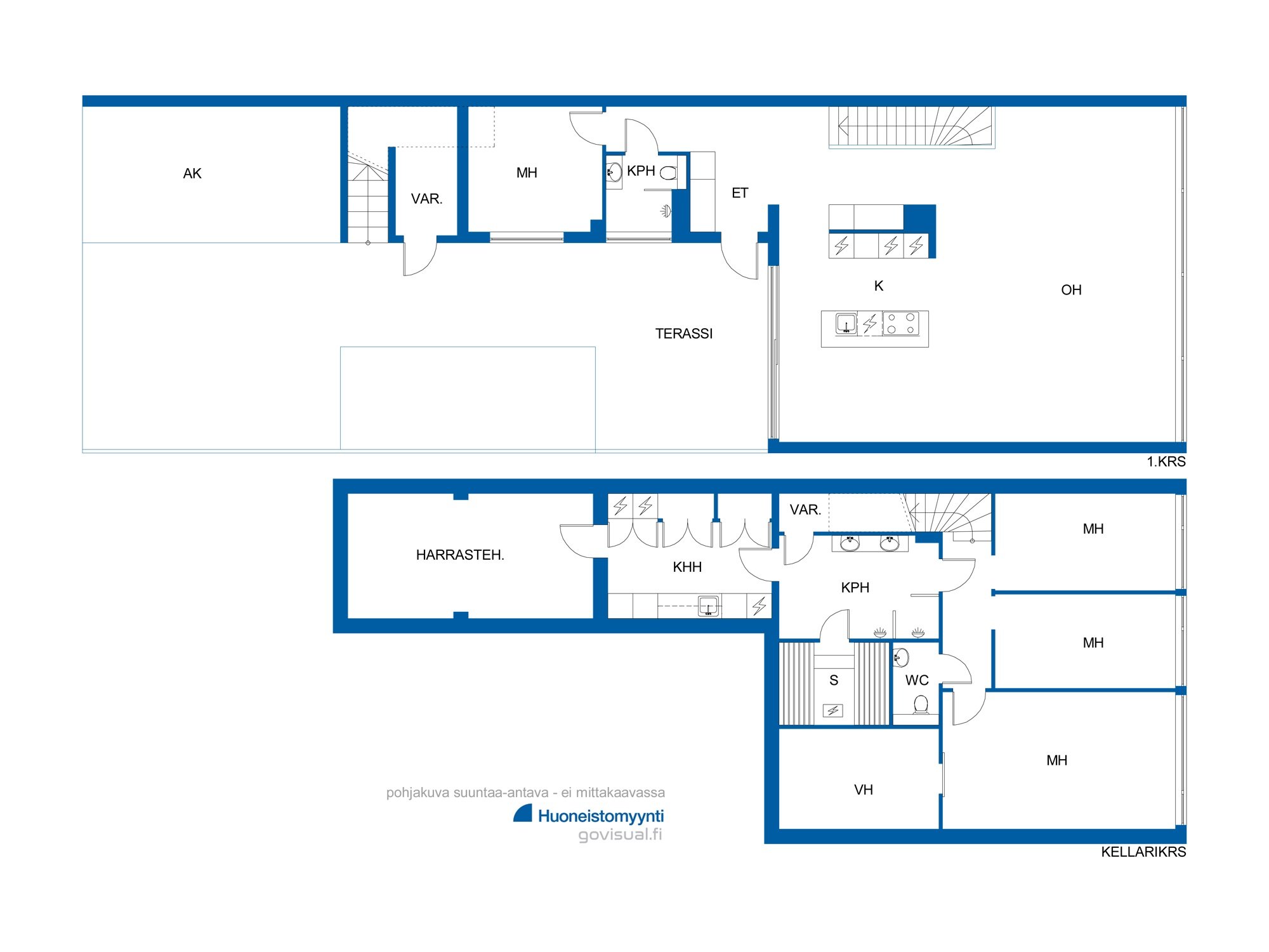 - 5h, avok., 2 x kph/wc, s, khh, vh, 2 x varasto, harrasteh., ak, terassi, kattoterassi.