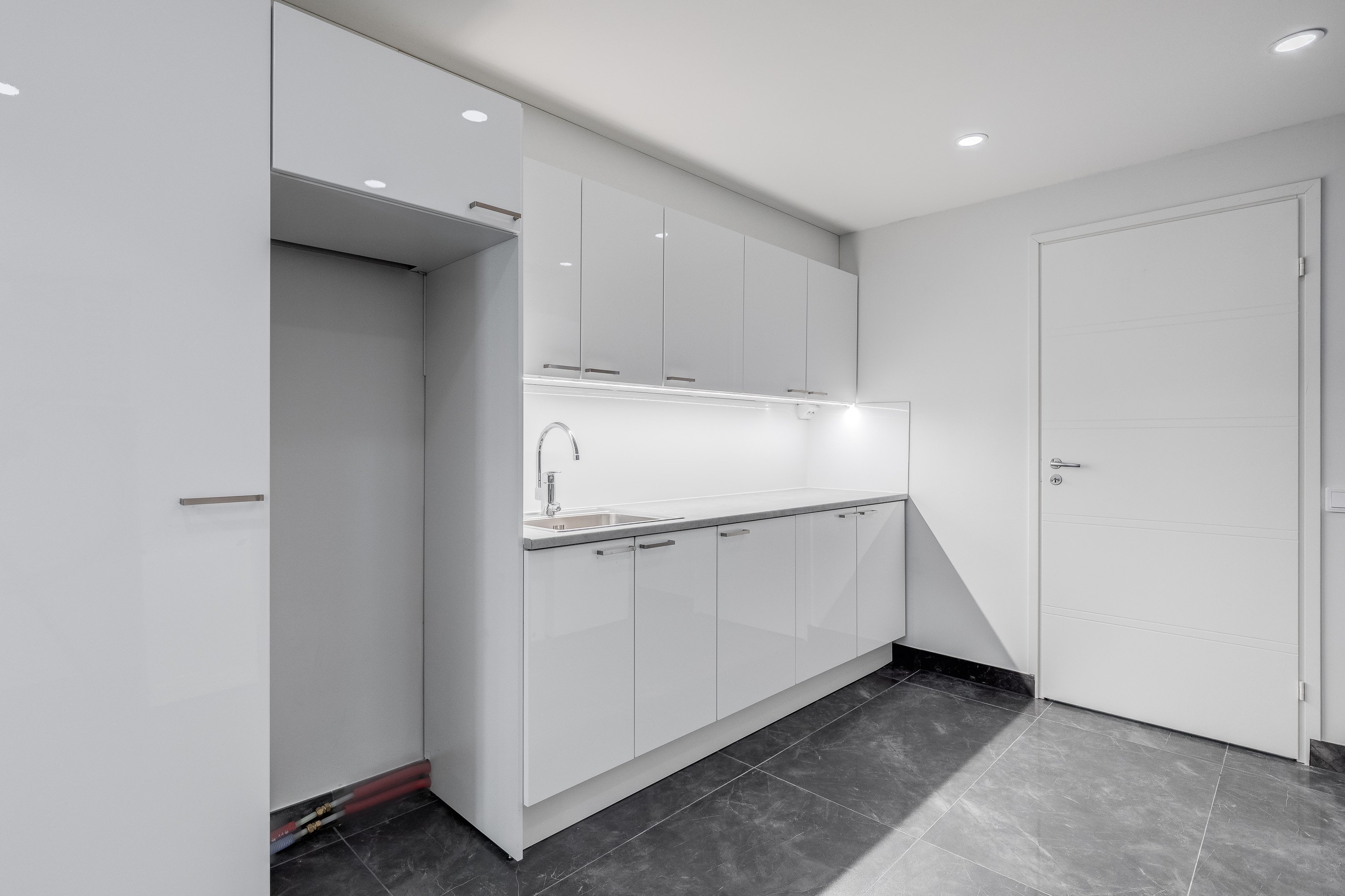 Pesukoneliitäntä, lattialämmitys, pesuallas, lattiakaivo, tila pesutornille, pöytätaso ja käsienpesuallas