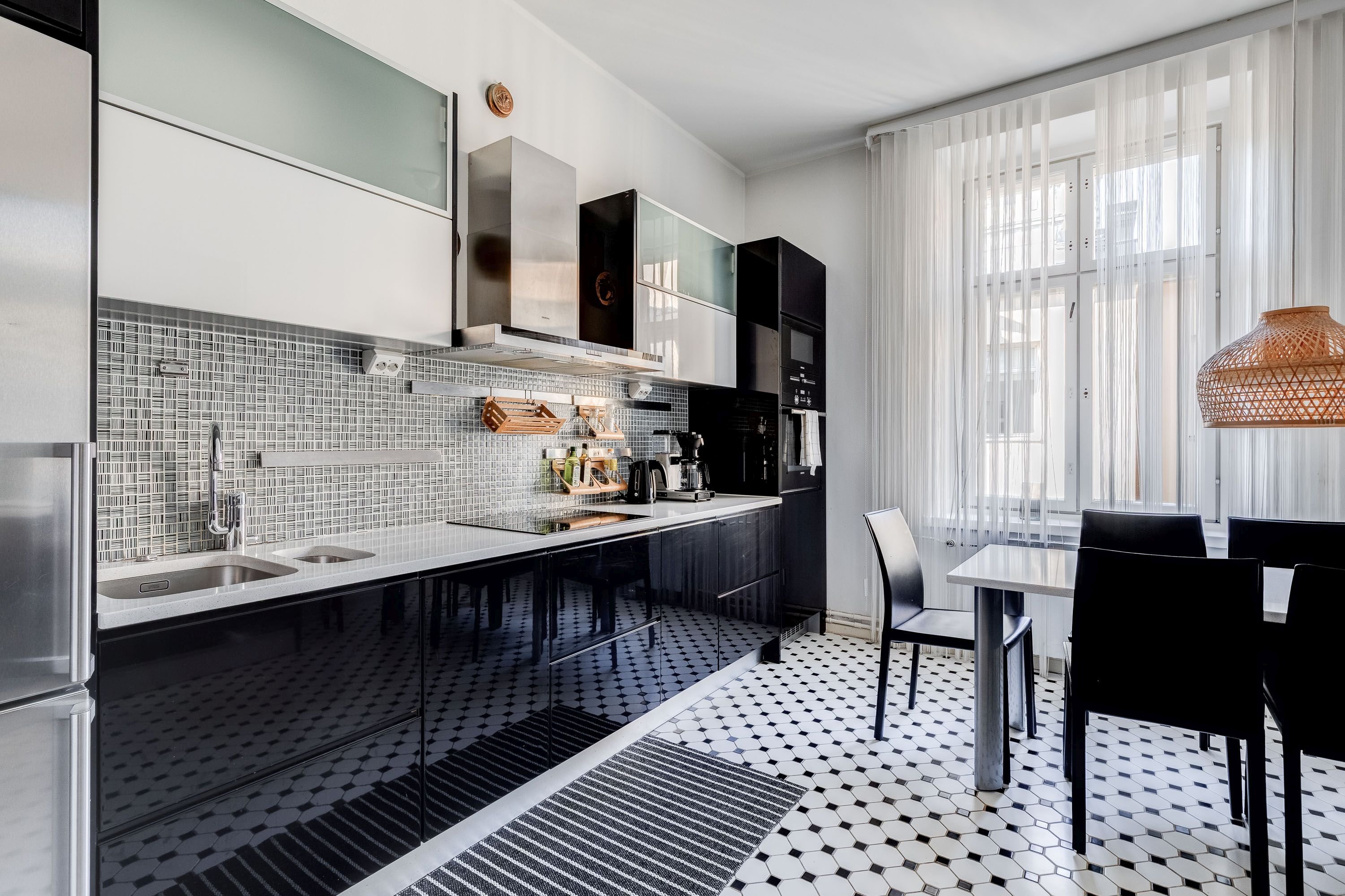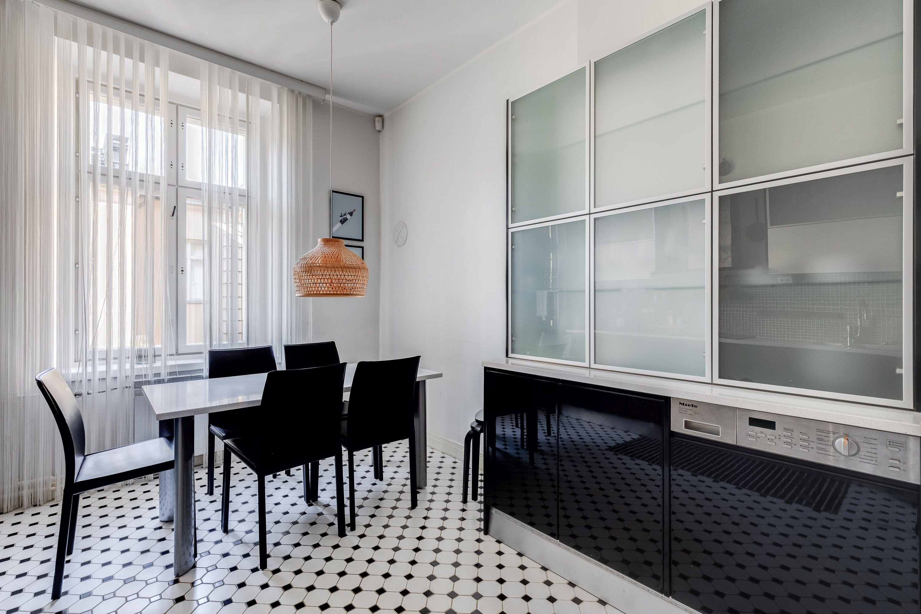 Induktioliesi, liesituuletin, kiertoilmauuni (kaluste), mikro (kaluste), astianpesukone (integroitu), kivitasot, pyykinpesukone