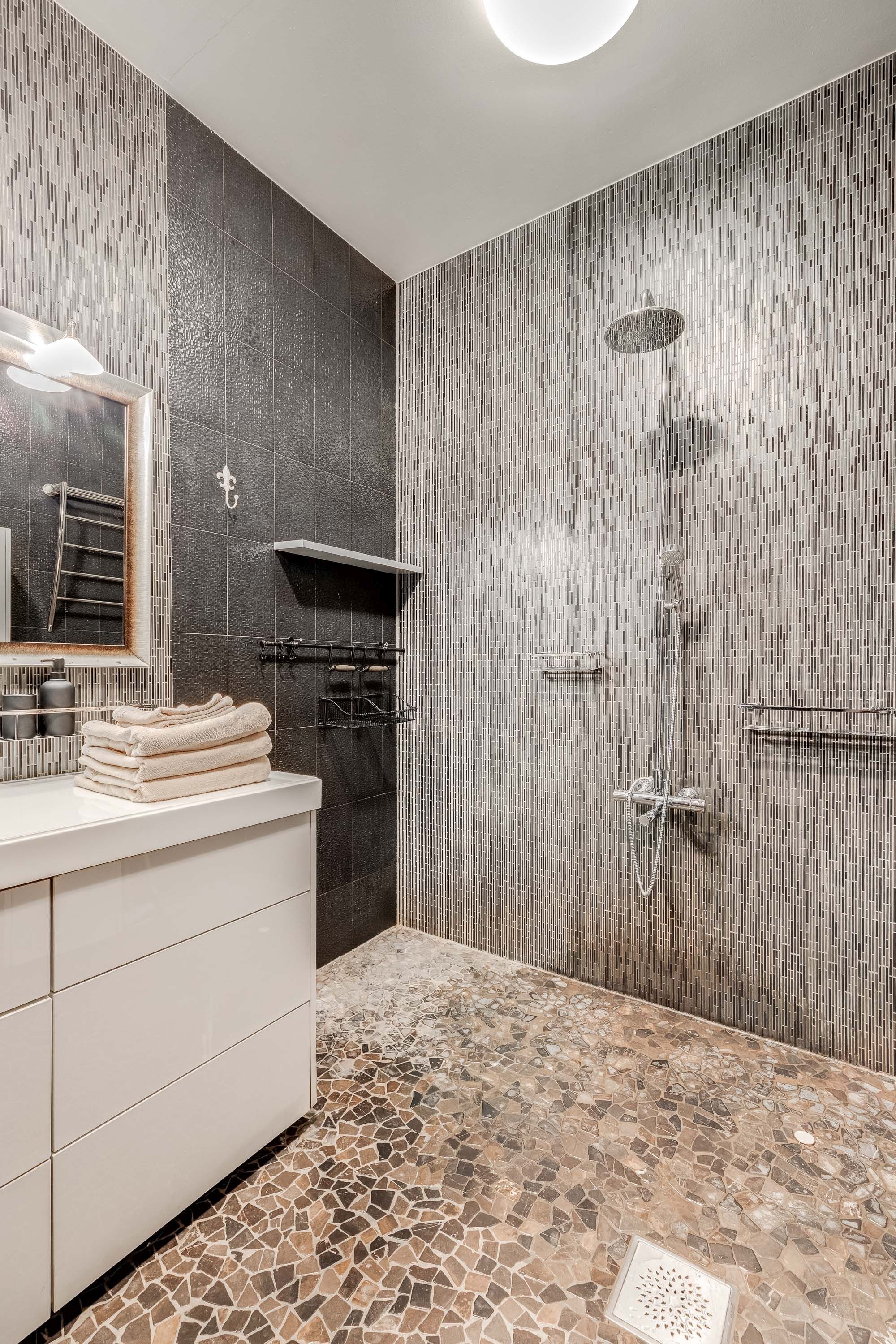 Suihku, allslaatikosto, peili, käsisuihku, wc-istuin, lattialämmitys, käsienpesuallas, laatoitus