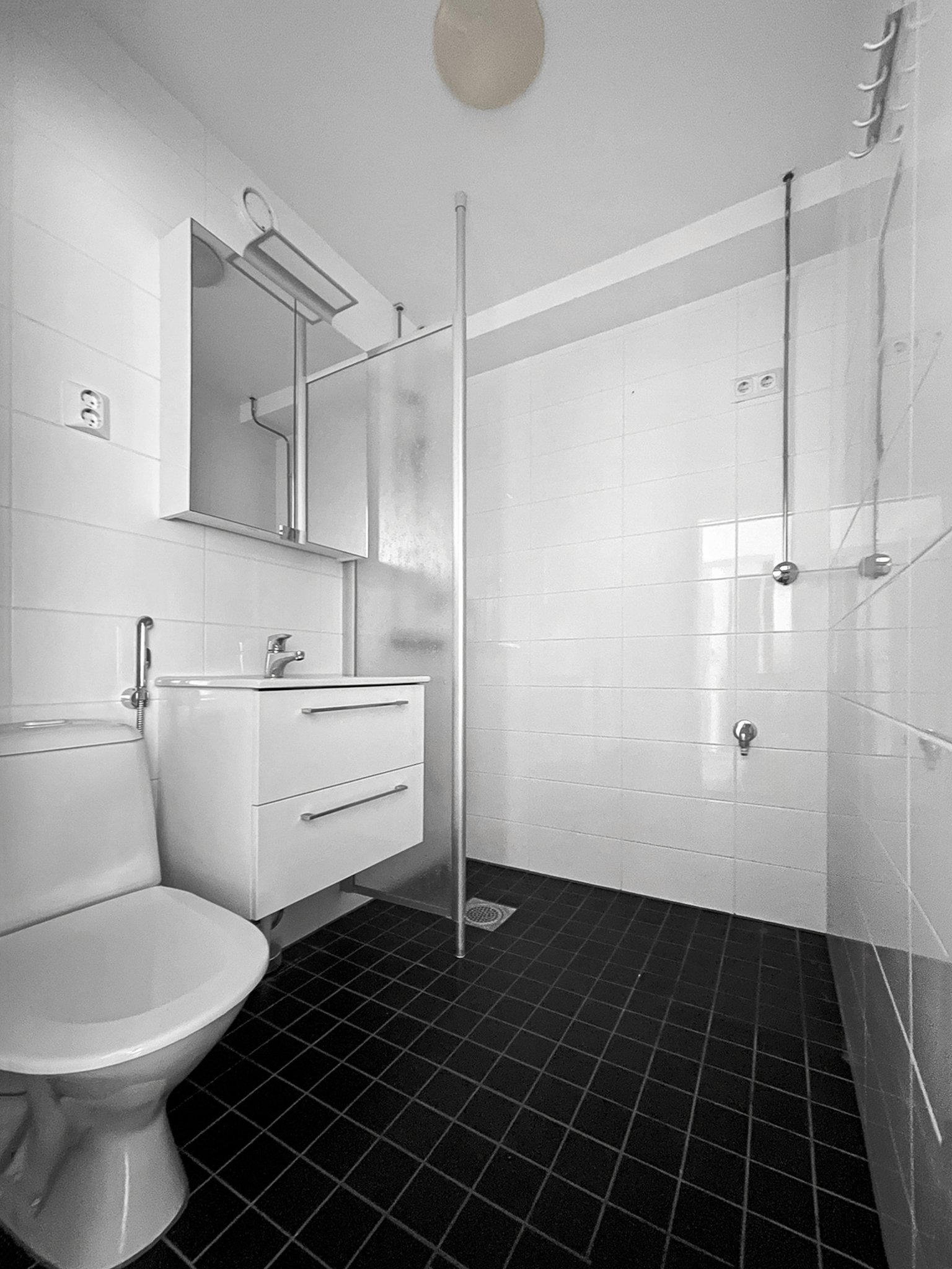 WC-istuin, suihku, pesukoneliitäntä, suihkuseinä, pesuallas, peilikaappi, allaskaappi ja lattialämmitys