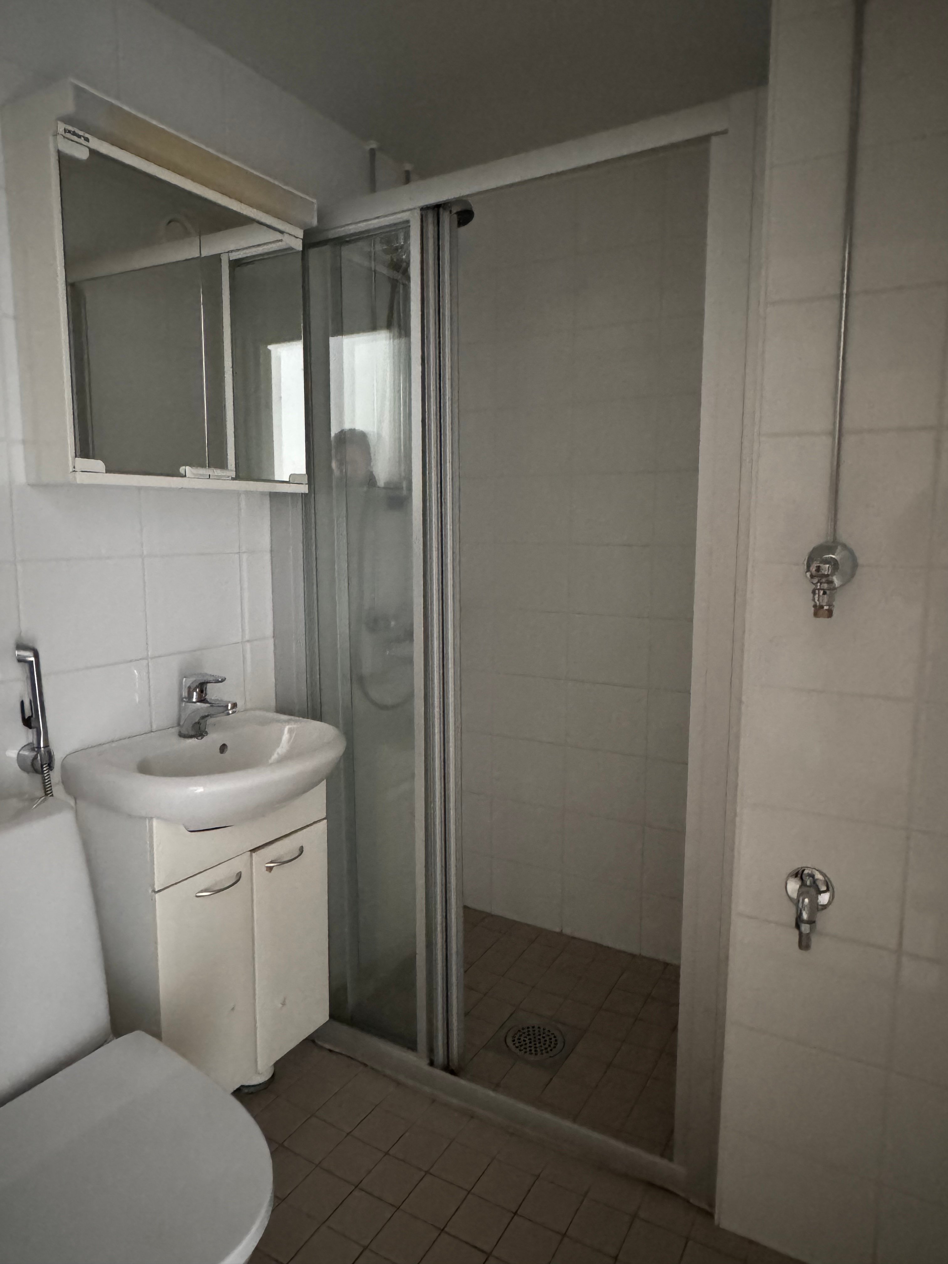 wc, peilikaappi, suihku, suihkuseinä, pesukoneliitäntä, käsienpesuallas, allaskaappi.