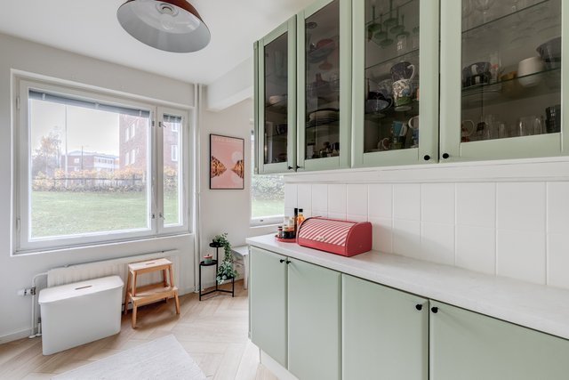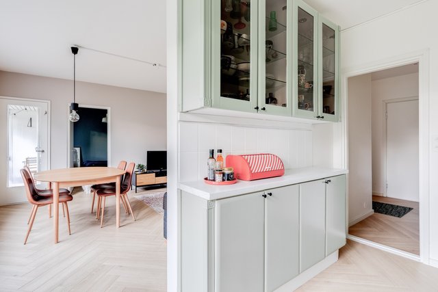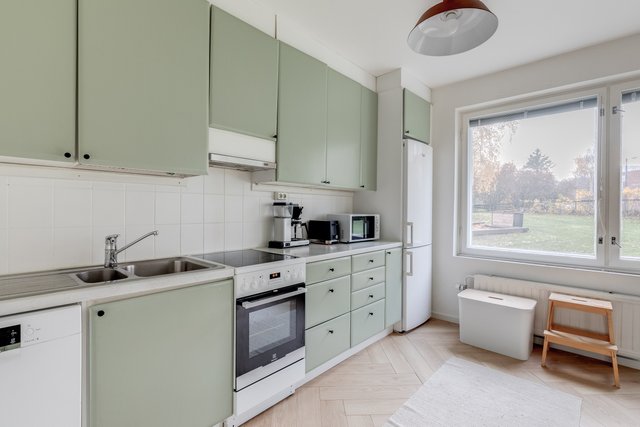Jääkaappipakastin, keraaminen liesi, liesituuletin, astianpesukone, kaapistojen ovet maalautettu (2020).
