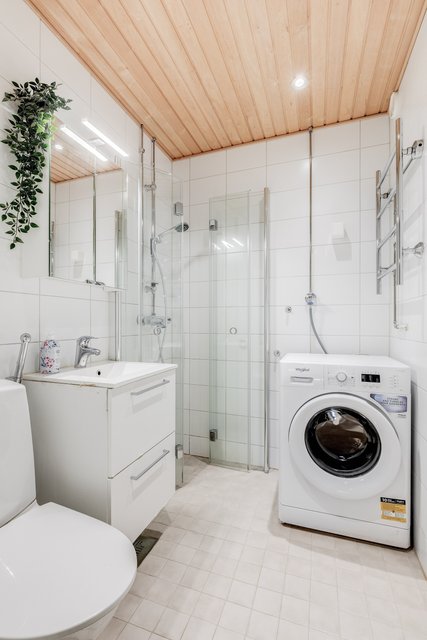 Suihku, suihkuseinät, peilikaappi, käsienpesuallas, wc, pyyhekuivain, pesukoneliitäntä, kaakeloitu, lattialämmitys, Led-valaistus (2020)