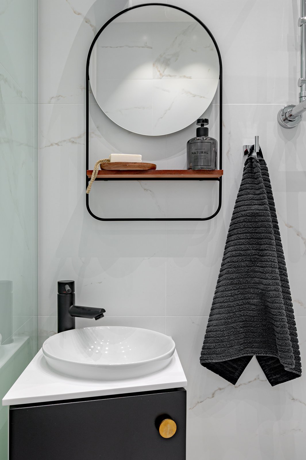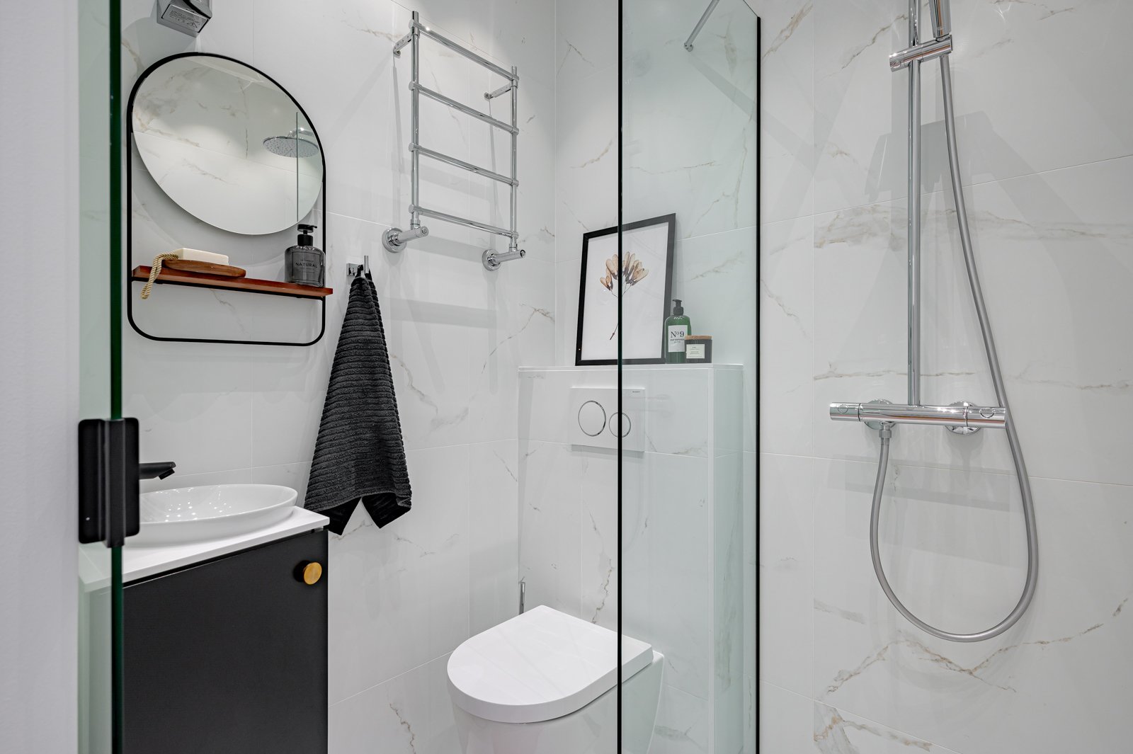 Helsingö ovi ja vedin, Corian-taso, upotettu malja-allas, musta Tapwell hana, musta Tapwell bidé, peili, kiinteävalo pistorasialla ja Grohe sadettajasuihku,