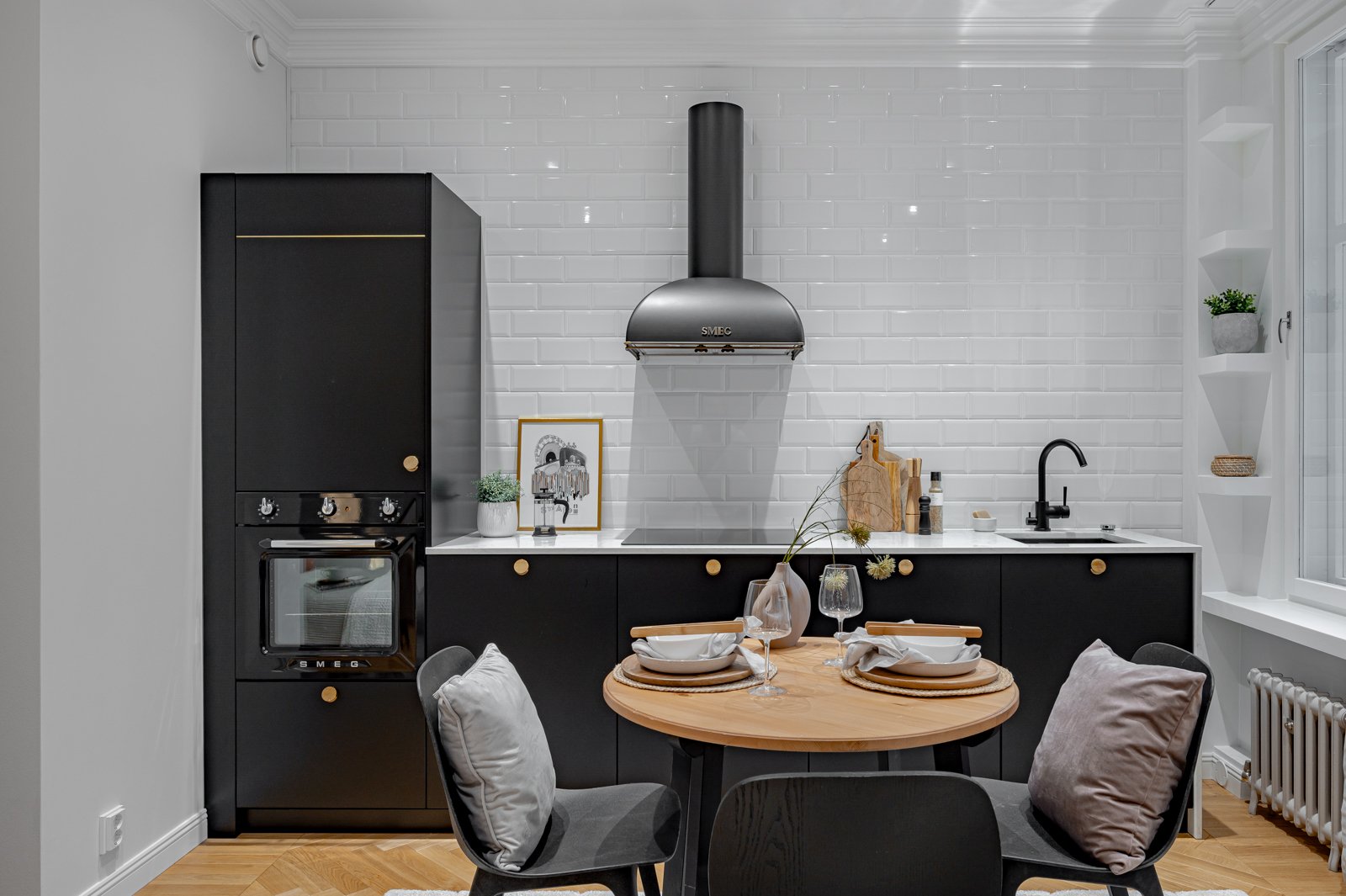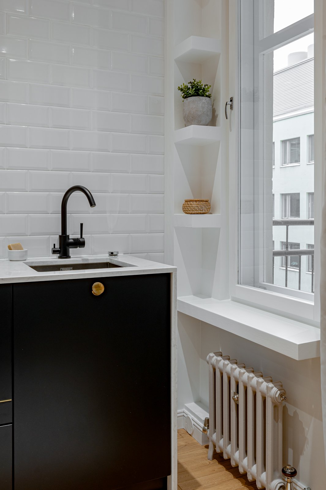 käytännöllisiä yksityiskohtia. Täydellisesti kalustettu ja varustettu Helsingö-keittiö. Keittiössä kaunis Compac Unique Arabescato kvartsitaso, Smegin kodinkoneita ja laadukas tason alle suunniteltu integroitu