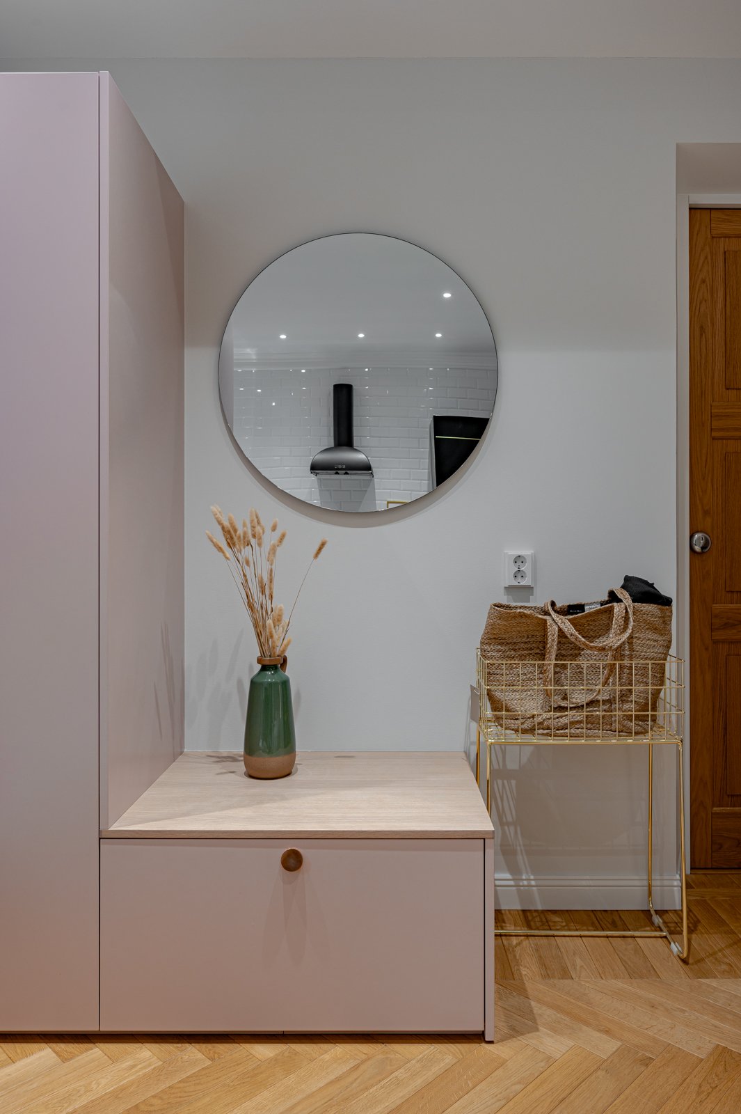 Eteisessä tilava Helsingön Blush Rose kaapistokokonaisuus, missä valkokuulto käsitelty