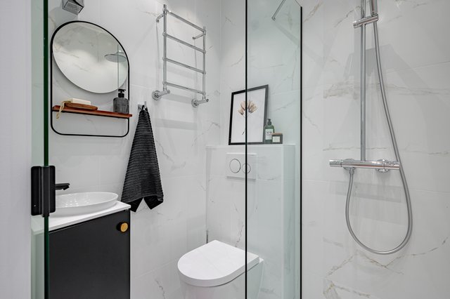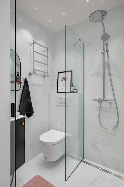 Cariitti CR-03 led-valaistus (mustat pienet led-valaisimet), Ceberit Slim-Line linjakaivo, lasinen suihkuseinä, lattialämmitys, Margaroli-kuivauspatteri,  seinä-wc Duravit,