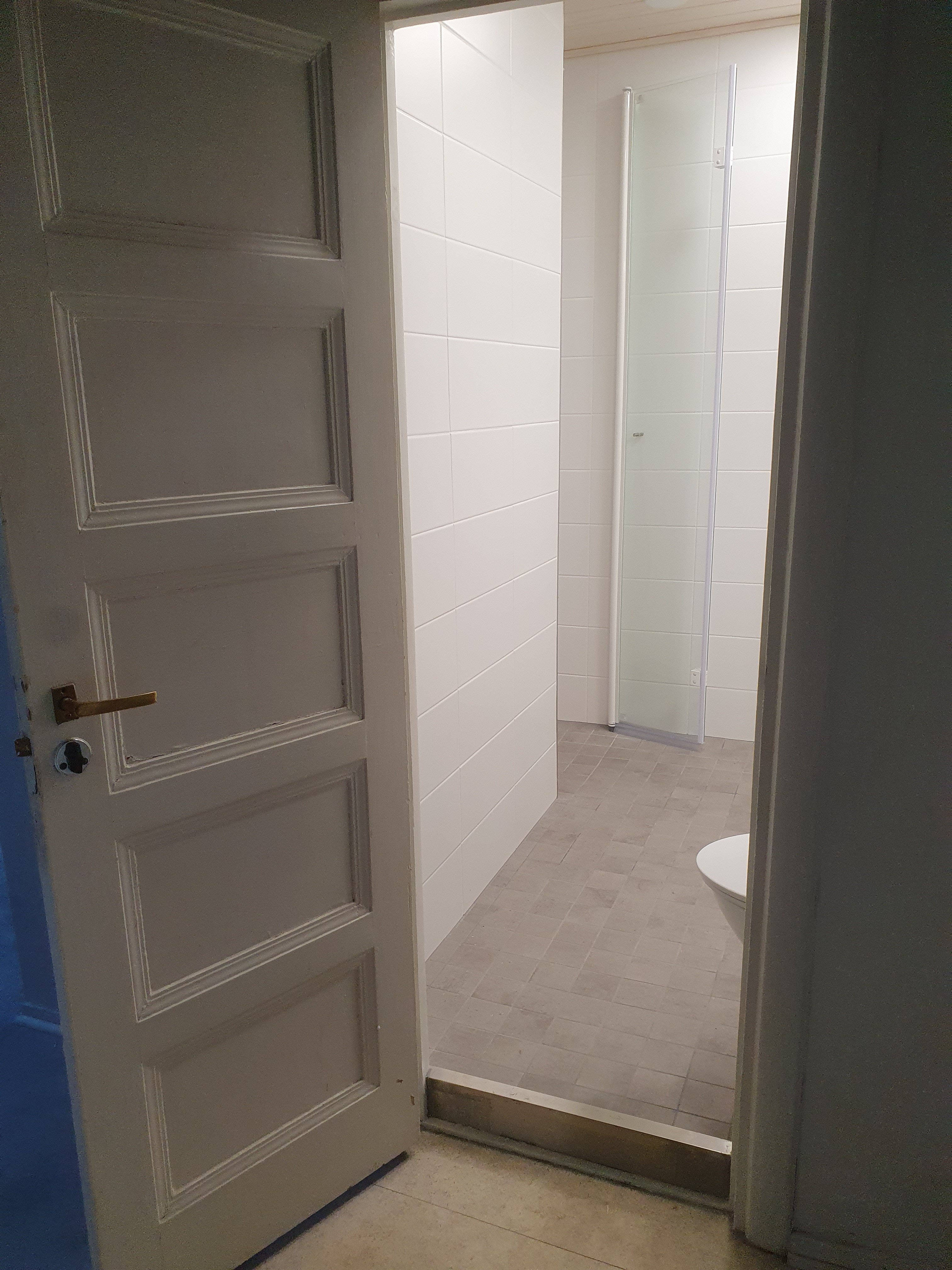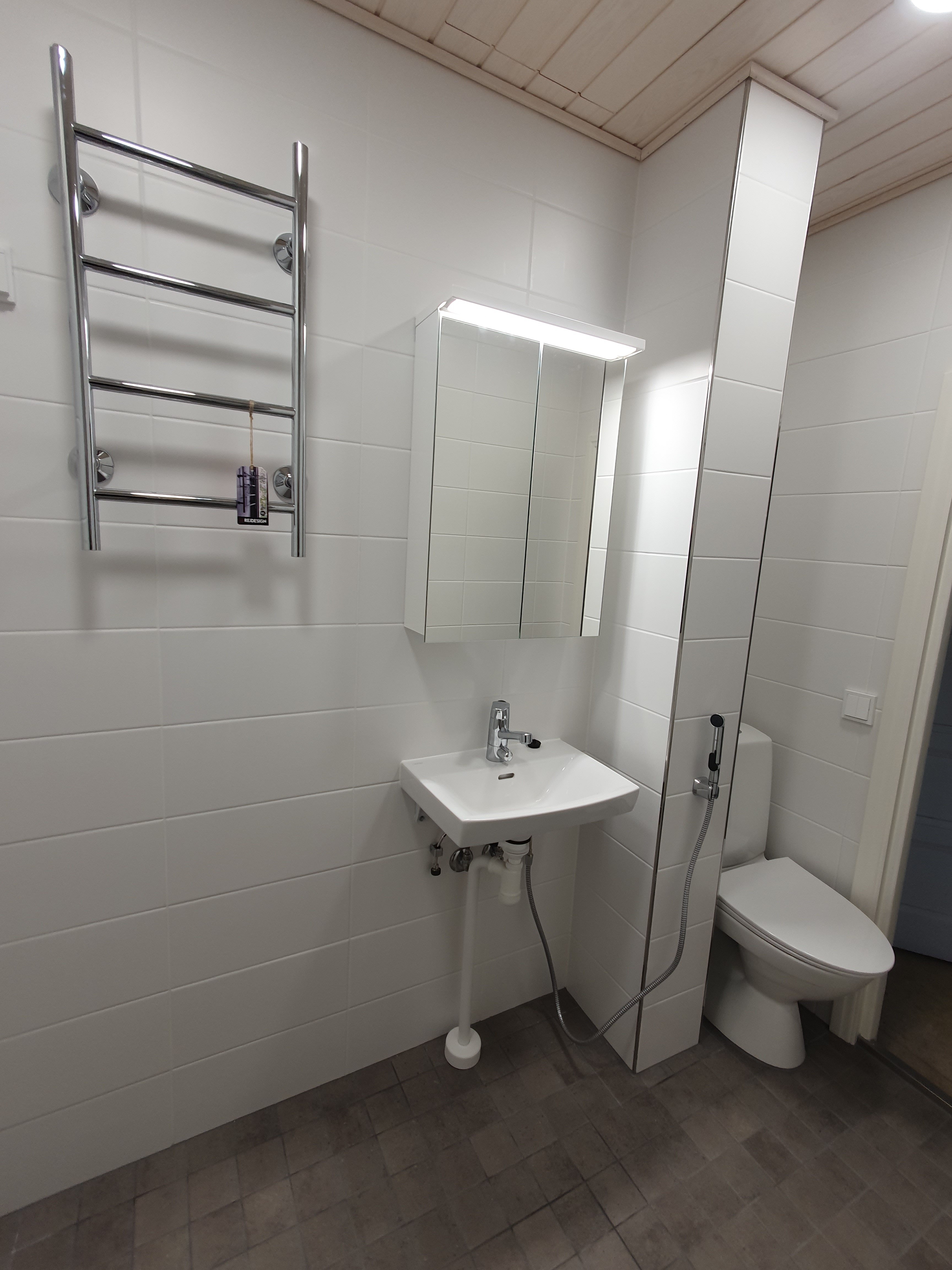 Suihkukaappi ja suihkuseinä, wc-istuin, käsienpesuallas, käsisuihku, peilikaappi, pyyhekuivain, seinät ja lattia laatoitettu. Kylpyhuone on äskettäin remontoitu ja käyttämätön.